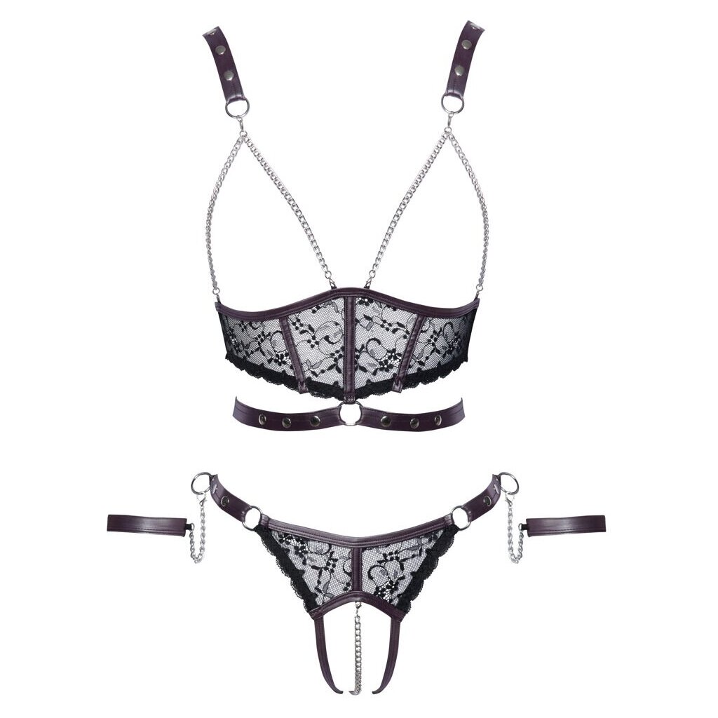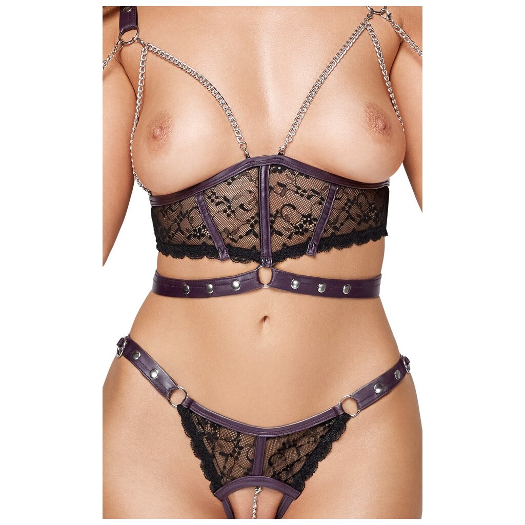 Set von Cottelli BONDAGE mit einem bustless Top, einem Slip im Schritt und zwei weichen Handschellen. Stilvoller Mix aus feiner schwarzer Spitze mit dunkelvioletten Details in Mattoptik und silberfarbenen Accessoires. Das Oberteil umrahmt die nackten Brüste mit Ketten. Der Taillengürtel am vorderen Ring kann mit Druckknöpfen verstellt werden, ebenso die Träger. Verstellbarer Hakenverschluss auf der Rückseite. Slip mit abnehmbarer, stimulierender Kette im offenen Schritt. Verstellbarer Bund mit Druckknöpfen. Die Bündchen können mit ihren Karabinerketten in die seitlichen Ringe am Bund eingehakt werden. Die weichen Knöchelbündchen lassen sich mit den verstellbaren Klettverschlüssen schnell an- und ausziehen.