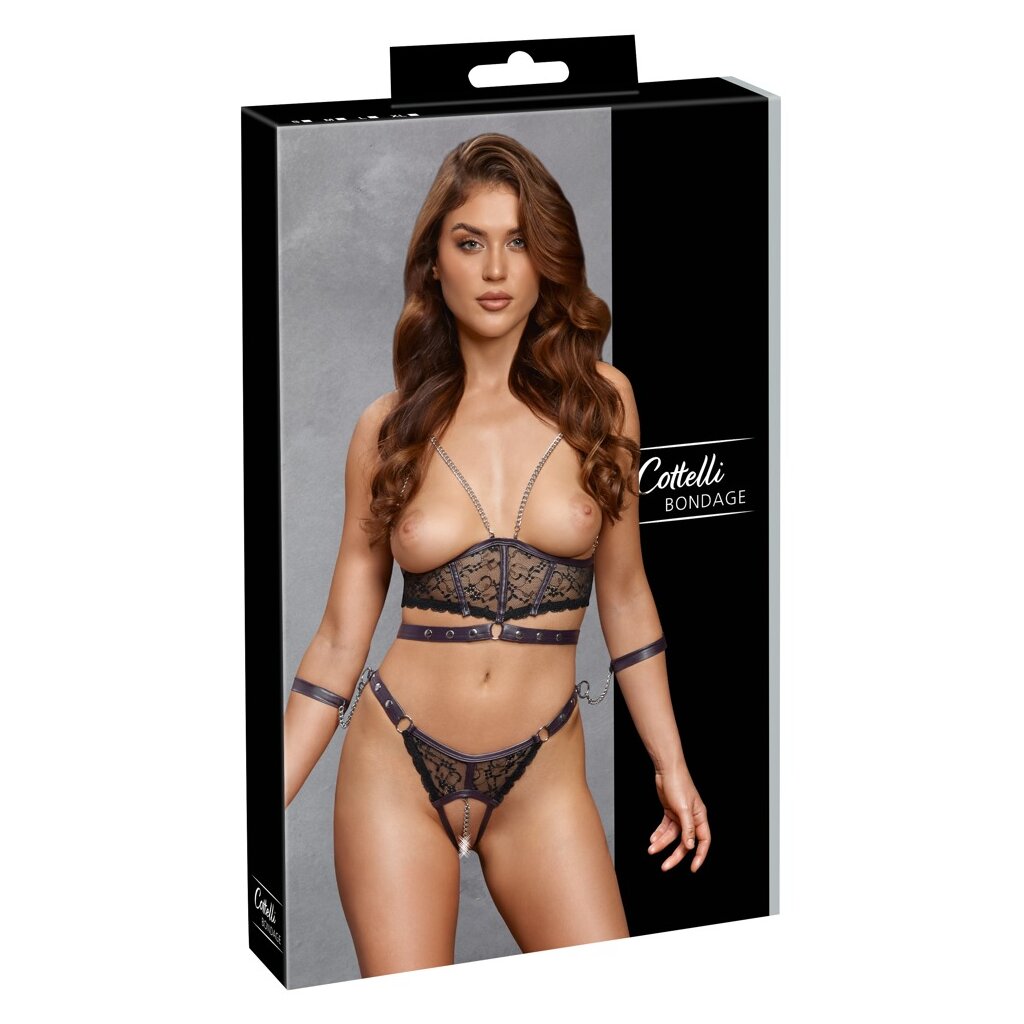 Ensemble ouvert de Cottelli BONDAGE comprenant un haut sans buste, un slip sans entrejambe et deux menottes souples. Mélange élégant de fine dentelle noire avec des détails mauves foncés d'aspect mat et des accessoires argentés. Le haut encadre les seins nus avec des chaînes. La ceinture sur l'anneau avant peut être ajustée à l'aide de boutons-pression, tout comme les bretelles. Fermeture à crochet réglable dans le dos. Culotte avec chaîne amovible et stimulante dans l'entrejambe ouvert. Ceinture réglable à l'aide de boutons-pression. Les poignets peuvent être accrochés aux anneaux latéraux de la ceinture à l'aide de leurs chaînes à mousquetons. Les manchettes souples s'enfilent et s'enlèvent rapidement grâce aux fermetures Velcro réglables.