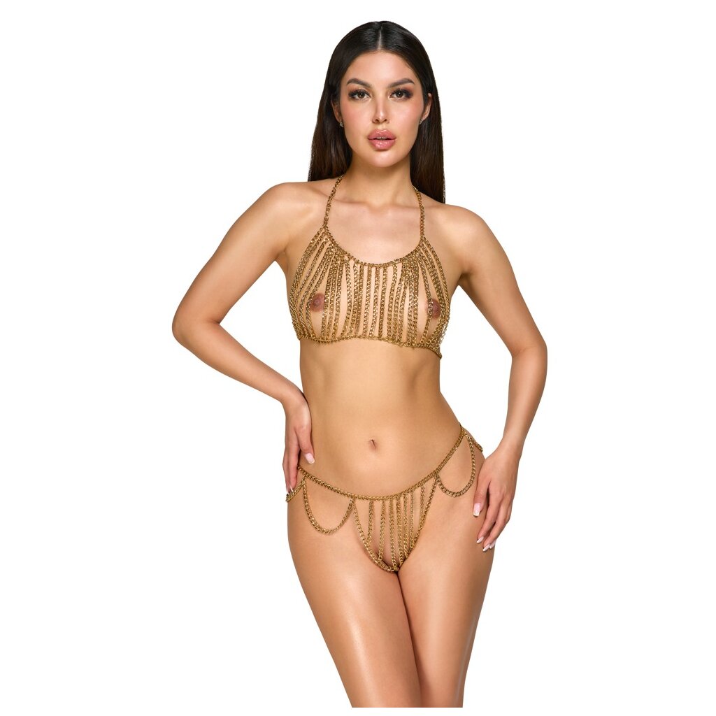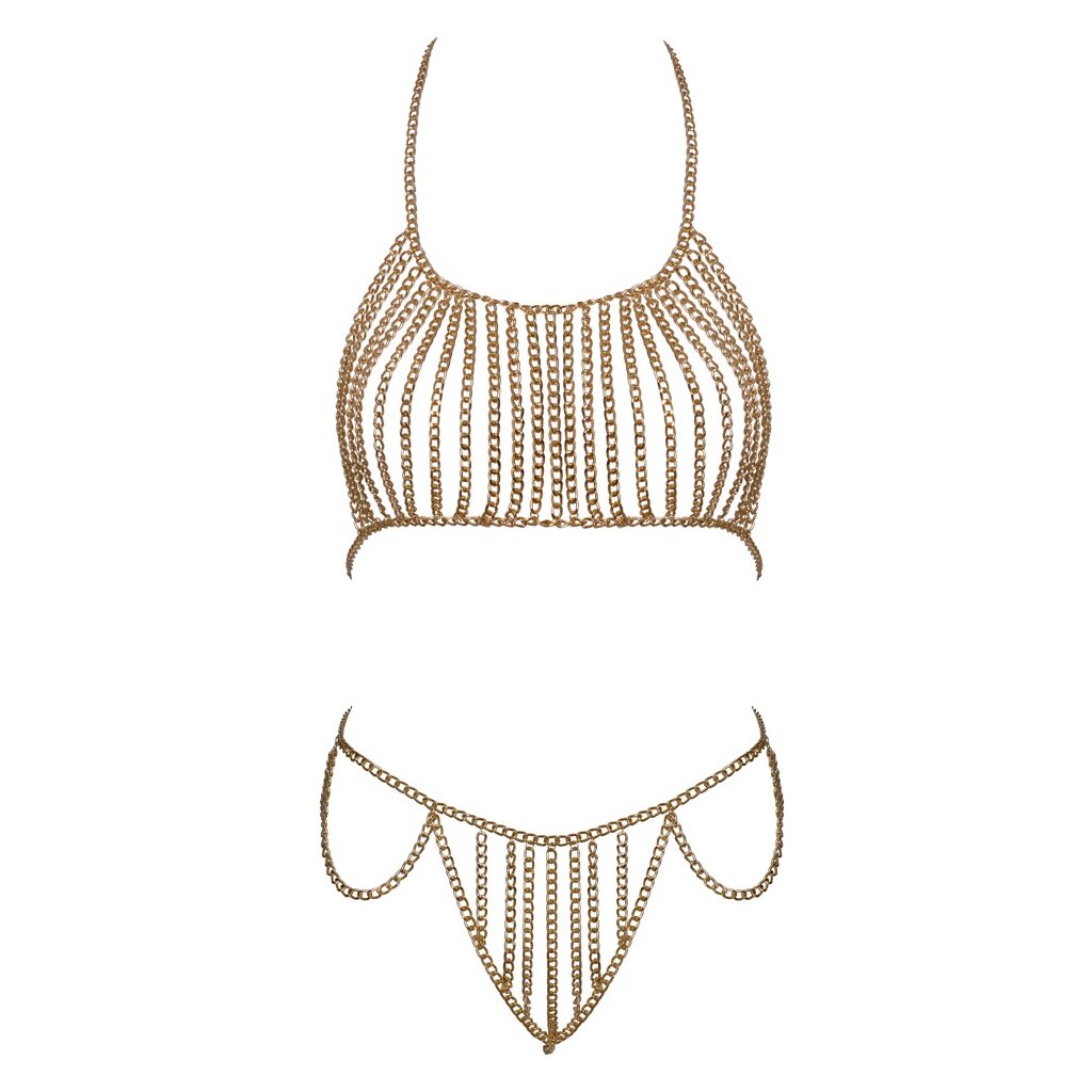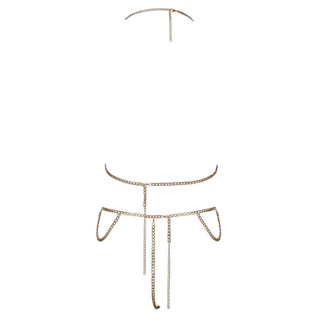Goldfarbener Ketten-Bikini von Cottelli ACCESSORIES mit Oberteil und String. Üppige Kettenverzierung vorne über Busen, Scham und Hüften. Reizvolle Kette im Schritt bis über den Po. Ketten-Neckholder, Rücken-Kette und String-Kette mit Karabinerverschlüssen individuell verstell- und anpassbar. Ob solo als Dessous für einen erotischen Auftritt oder stylisch kombiniert mit Bademode und figurbetonten Outfits – der glamouröse Ketten-Bikini ist immer ein aufregender Blickfang!