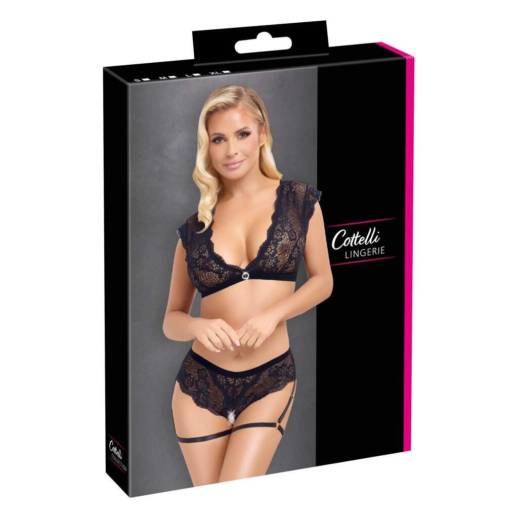 Enchanting top and sophisticated crotchless panties made of black lace by Cottelli LINGERIE. Both pieces are made of soft, stretchy, floral lace for maximum comfort. The top features short sleeves and a deep neckline on the front and back. Adorned with a rhinestone ring on the front. Adjustable stretch straps on the back to keep everything in place. Additional hook closure. High-cut panties with adjustable thigh straps. Seductively open at the crotch.