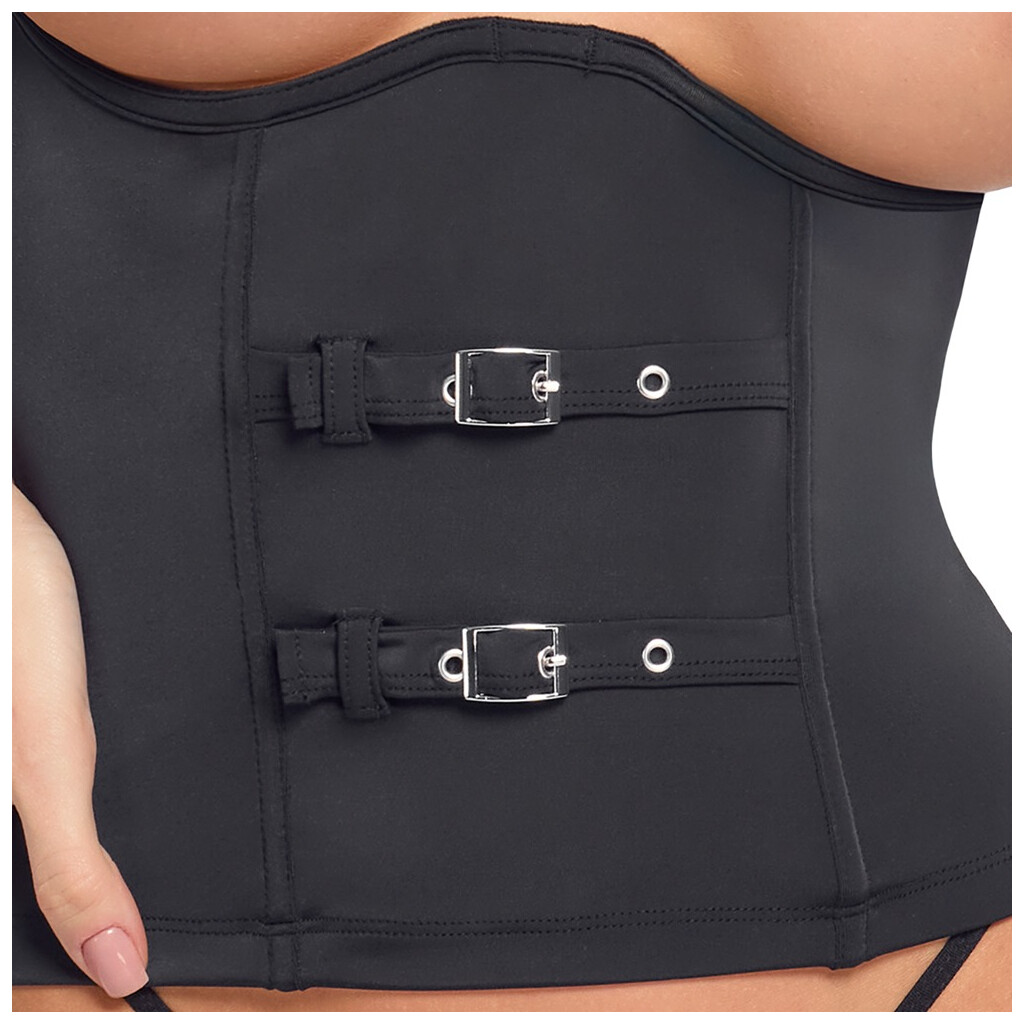 Schwarzes Taillenkorsett von Cottelli PARTY mit verstellbaren Schnallenriemen an den Seiten. Mit Bügeln für leichten Halt der freiliegenden Brüste. Zwei integrierte Formstäbe und 2 dekorative, verstellbare Schnallenriemen vorne. Hakenverschluss hinten. Solo getragen ist es ein sinnlicher Blickfang. Mit einem Hemd oder einer Bluse darunter getragen, ist es ein stilvolles Korsett für Looks, die Kurven betonen. Rundum weich und elastisch für maximalen Komfort. Der passende Mini-String ist im Lieferumfang enthalten!