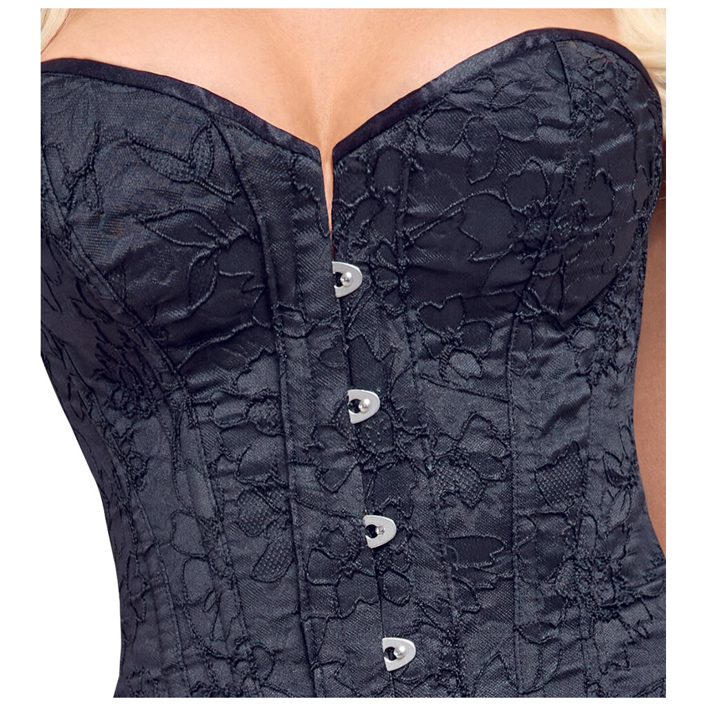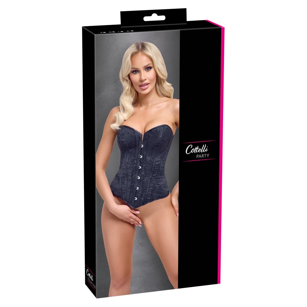 Trägerlose Vollbrustcorsage von Cottelli PARTY in seidenmattem Schwarz. Integrierte Formstäbchen (6 pro Seite) für eine definierte Silhouette und wohlgeformte Kurven. Schnellverschluss an der Vorderseite (Haken & Ösen) für ein leichtes An- und Ausziehen. Die durchgehende Schnürung am Rücken ist mit Stoff gefüttert, so dass keine Haut durchscheinen kann.