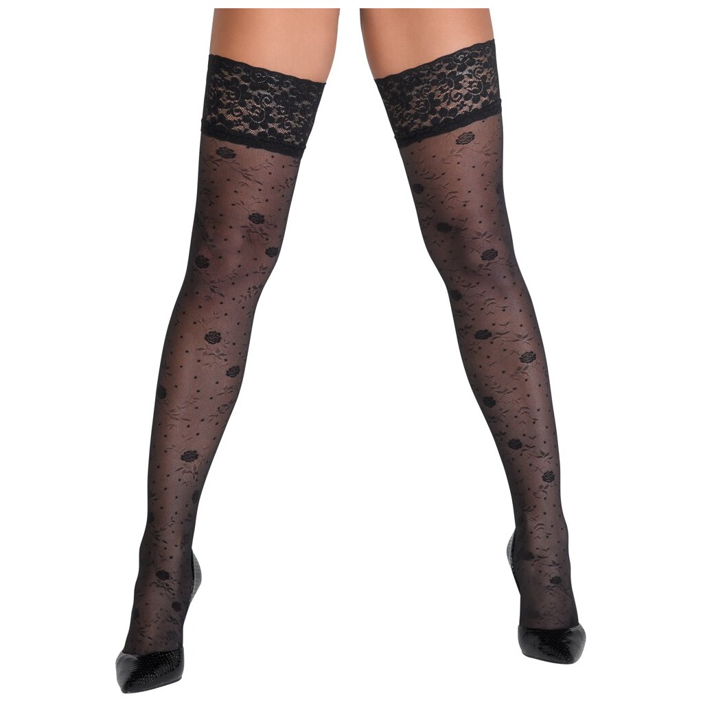 Bas noirs sans maintien de Cottelli LEGWARE avec un délicat motif de roses. Dans la finition en dentelle de 9 cm de large avec un renfort en silicone pour une assise antidérapante et un maintien optimal. Pied légèrement préformé. 20 deniers. Certifié Oeko-Tex. Taille 1 / Composition du matériau : 88% polyamide, 12% élasthanne