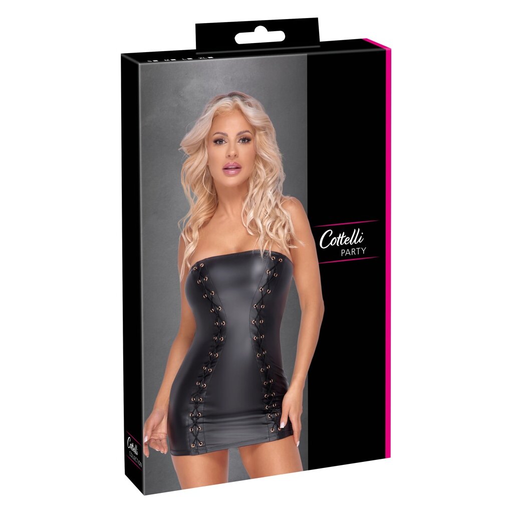 Short strapless tube dress in a sophisticated black matt look. Narrow cut and fitted with rose gold-coloured metal eyelets for the 2 decorative laces at the front in a figure-hugging hourglass look. Soft and highly elastic for high wearing comfort. Size M / Material composition: 90% polyester, 10% spandex