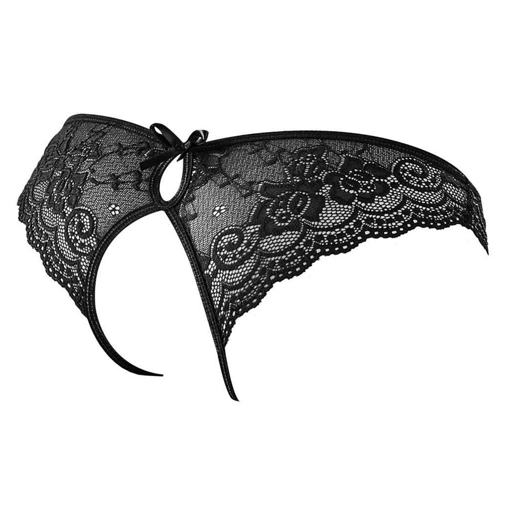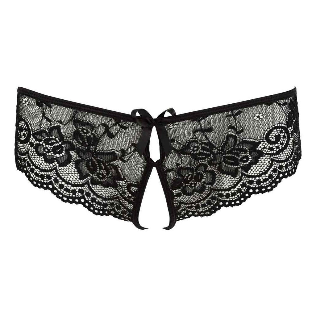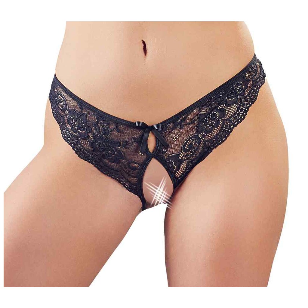 Cette jolie culotte combine une belle dentelle à motifs floraux avec des découpes à l'avant et à l'arrière qui sont décorées de nœuds. L'entrejambe séduisant et ouvert est seulement couvert par 2 bretelles extensibles. Le slip est très confortable grâce à sa forte proportion de spandex et s'accroche aux courbes féminines.