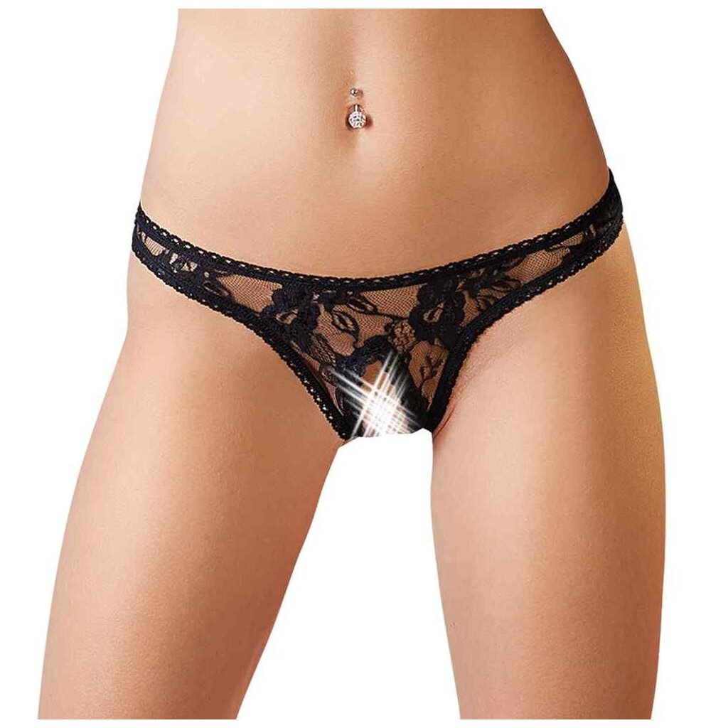 Cordon délicat fait de dentelle florale. Le string est ouvert de manière invitante au niveau de l'entrejambe.