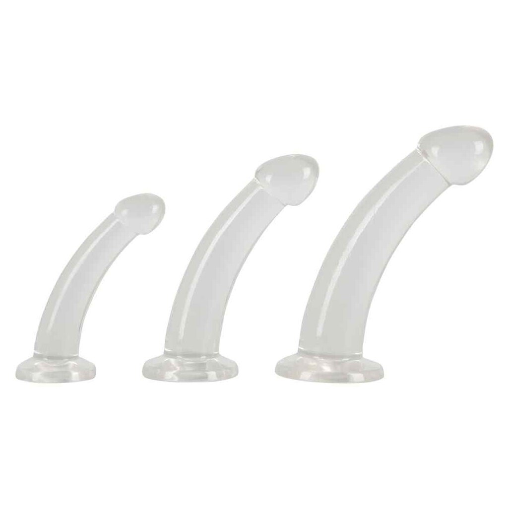 Each transparent dildo is wonderfully curved and extremely flexible. The dildos also have pronounced glans and a strong suction cup.