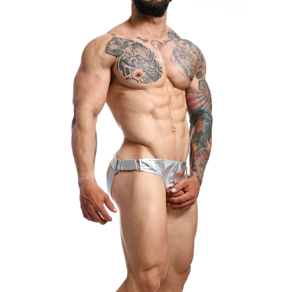 The Dngeon Cockring Jockstrap: a synthesis of bold design, superior comfort and ethically orientated production values. Proudly worn with wide straps that comfortably hug your hips, every detail, down to the strategically placed metal studs, draws attention to itself. Beyond its aesthetic appeal, the jockstrap's design not only offers a tantalising sight, but also promises a smooth appearance under tight-fitting clothing. One Size / Material: PU leather | metal