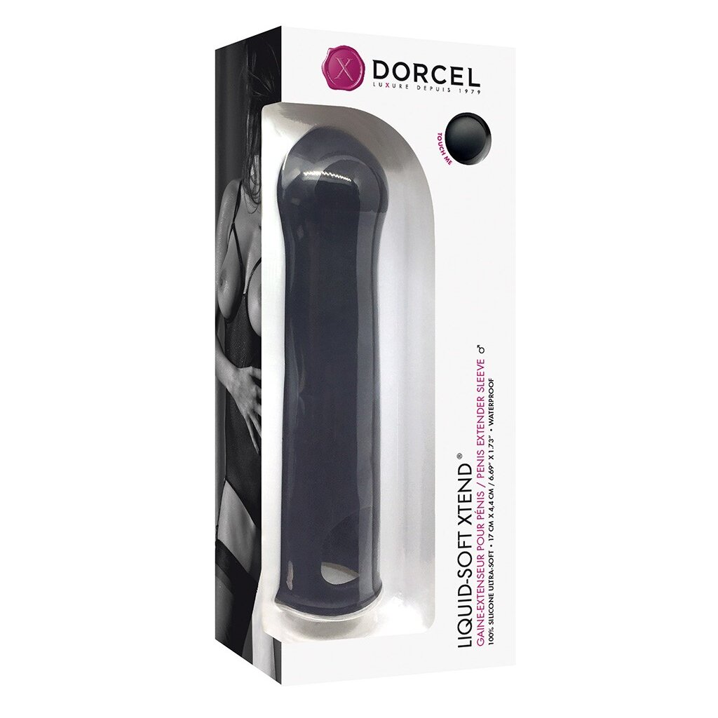 Discover the high-quality Liquid-Soft Xtend Black penis sheath from DORCEL and experience a completely new sensation of pleasure! With LIQUID-SOFT XTEND®, an ultra-comfortable penis sheath covers your penis like a second skin, enlarging it and providing pleasurable stimulation. The ring encloses your testicles and not only has an erection-enhancing effect, but also delays your ejaculation for long-lasting pleasure. The extremely soft and stretchy silicone material adapts perfectly to all penis sizes, so you can feel completely comfortable. With a size of Ø 4.4 x 17 cm and a weight of 0.208 kg, the penis sheath is handy and effective. It is waterproof, so you can also have carefree fun in the water. In elegant black and made of high-quality silicone, this penis sheath is not only functional but also stylish. Discover new dimensions of pleasure with the Liquid-Soft Xtend penis sleeve from DORCEL!