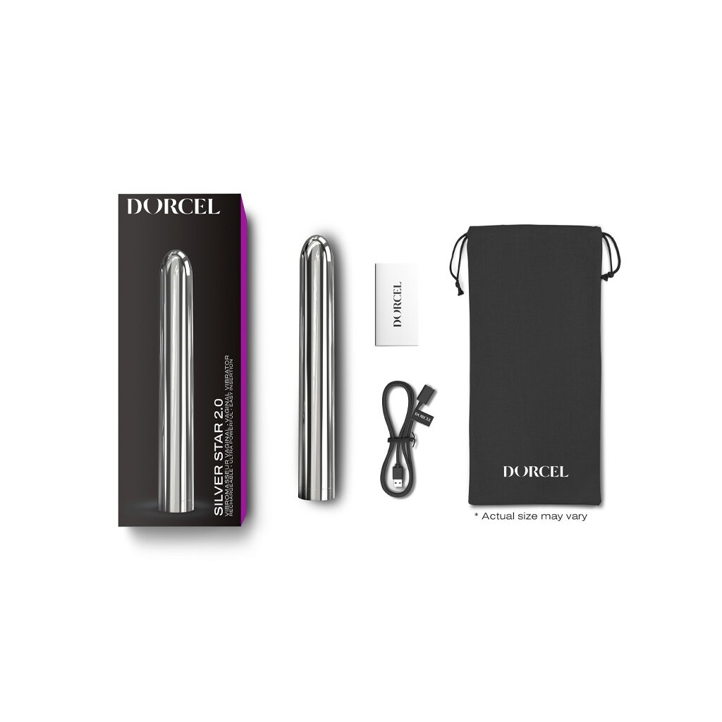 Avec le vibromasseur Silver Star 2.0 en argent élégant de DORCEL, vis des moments de plaisir inoubliables ! Le moteur puissant t'offre 10 modes de vibration différents pour te gâter exactement comme tu le souhaites. Grâce à la batterie rechargeable, tu peux profiter de ton plaisir tout en préservant l'environnement. La pointe conique ultra-résistante et le corps super lisse assurent une insertion agréable et un plaisir intense. Avec une longueur insérable de 15 cm, tu as suffisamment de marge de manœuvre pour réaliser tes fantasmes. Le temps de charge n'est que de 150 minutes, mais le vibromasseur t'offre un plaisir ininterrompu pendant 120 minutes. Offre-toi ce produit de haute qualité et découvre de nouveaux sommets de plaisir !