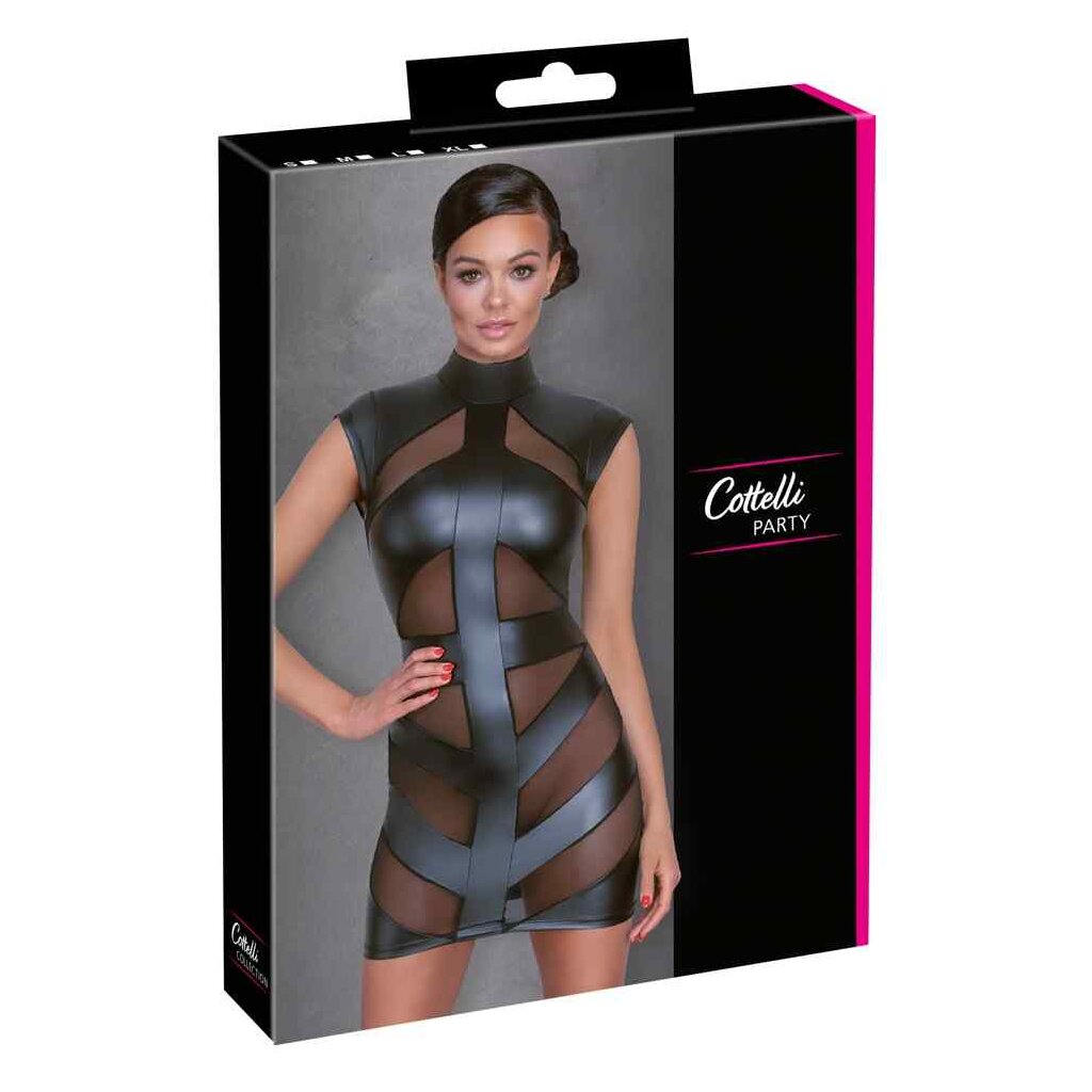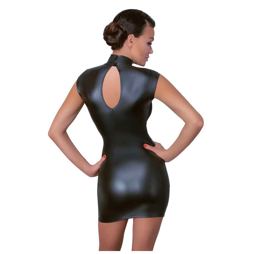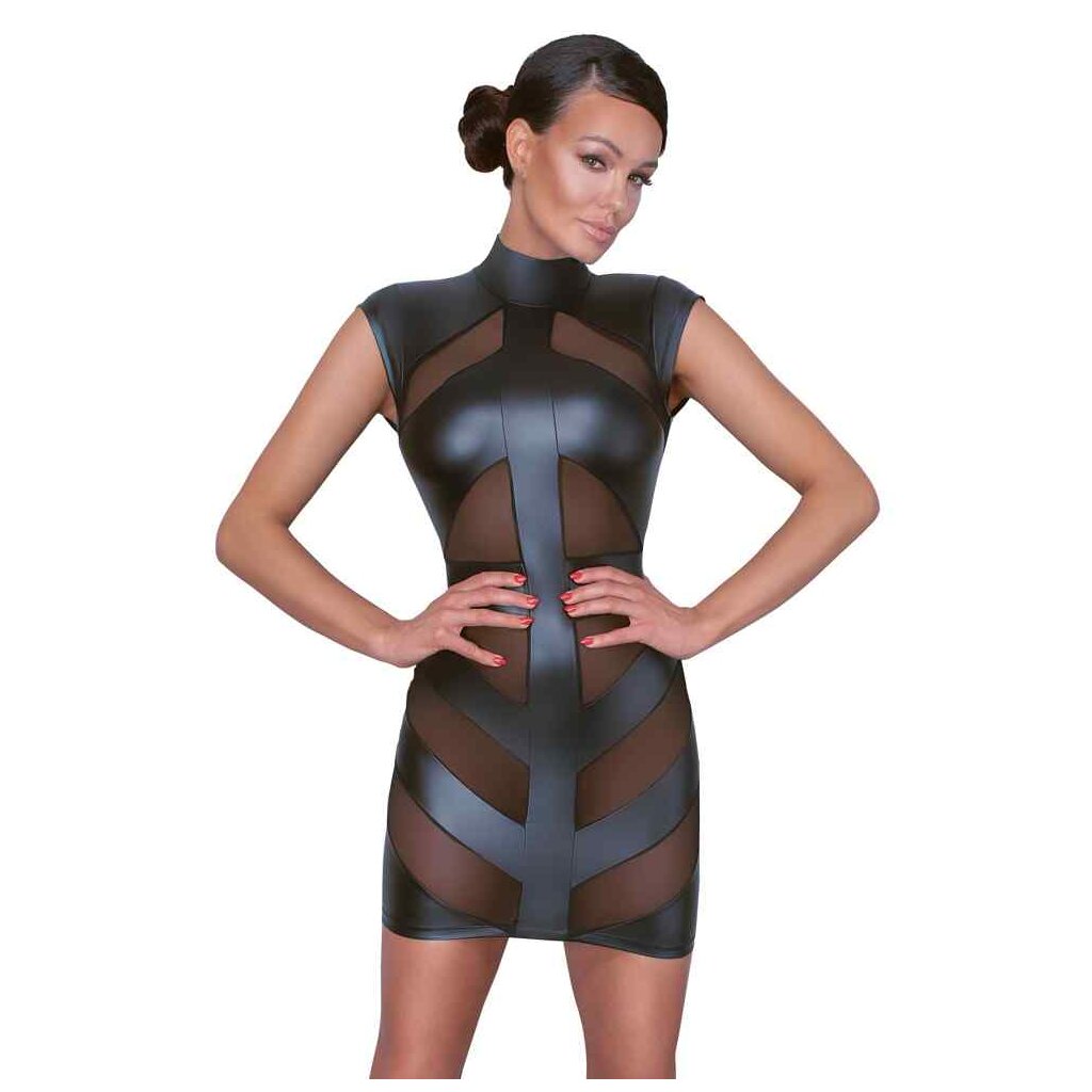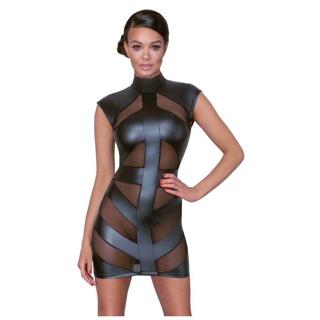 Waisted short dress by Cottelli PARTY in black matt look with transparent powernet inserts in the front. Stand-up collar with 2 buttons in the neck, below large oval cutout in the back. Soft and highly elastic for high wearing comfort.