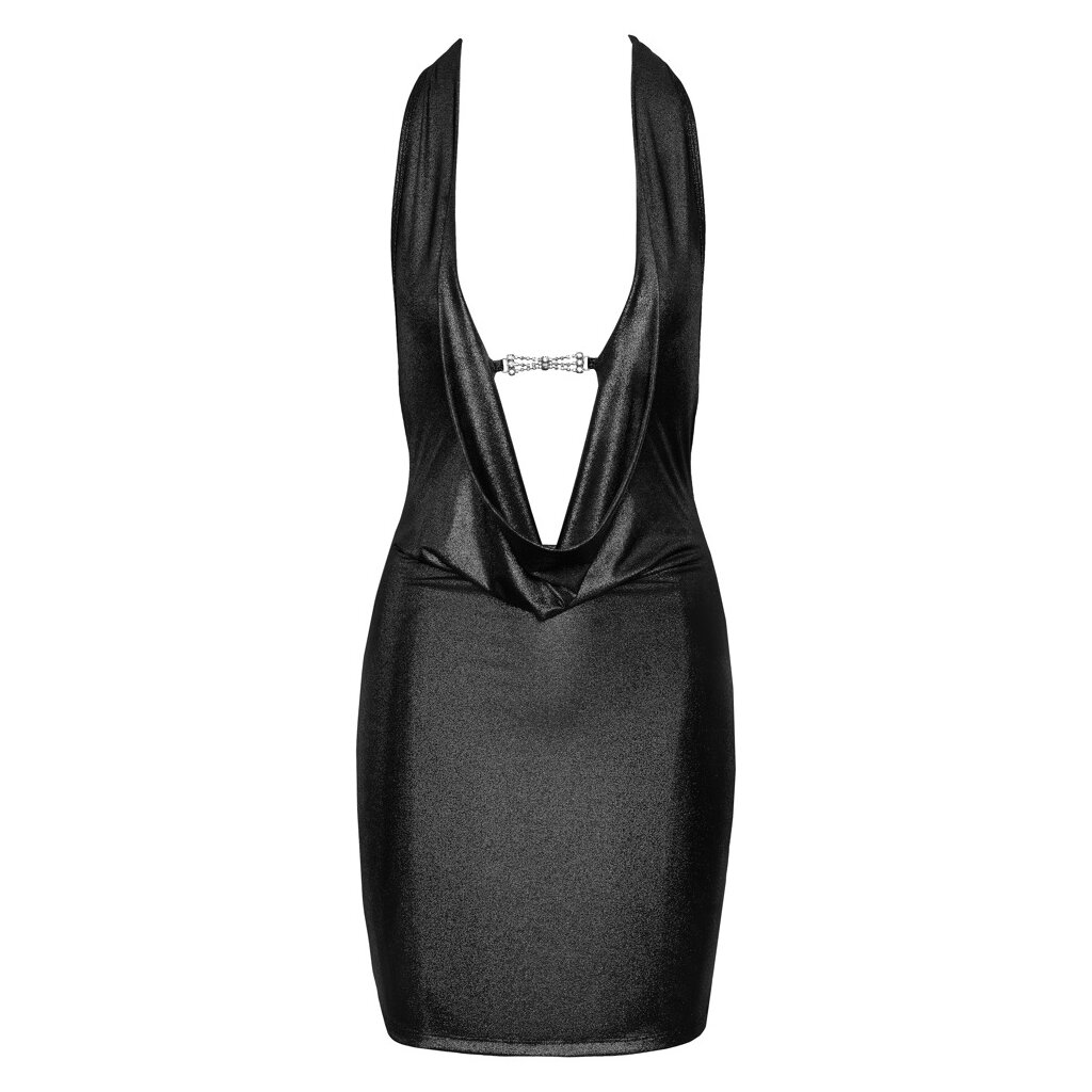 Short dress by Cottelli PARTY in iridescent silver shine. Tight waisted cut with extra deep waterfall neckline, which is only held together by a decorative rhinestone clasp. With halter neck - excitingly backless. Beautifully elastic all around for a skin-tight fit and high wearing comfort.