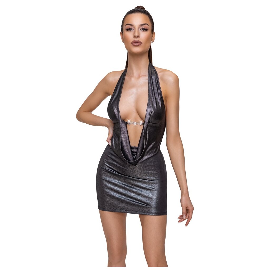 Robe courte de Cottelli PARTY en argent brillant iridescent. Coupe ajustée à la taille avec un décolleté cascade très profond, qui n'est maintenu que par un fermoir décoratif en strass. Avec une encolure dos nu - un dos nu excitant. Magnifiquement élastique tout autour pour une coupe moulante et un grand confort de port.