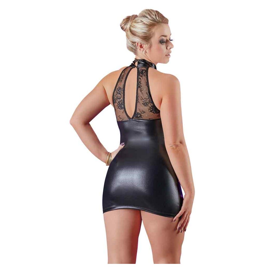 Cette robe noire à col montant est faite d'un beau mélange d'aspect mouillé brillant et de dentelle délicate. Les délicats empiècements en dentelle se trouvent dans la zone du décolleté et dans le dos. Cette robe sexy et moulante épouse également vos courbes pour vous donner une silhouette à couper le souffle ! Il y a 2 boutons pression à l'arrière du col montant. Wet look 92% polyester, 8% spandex ; dentelle 90% polyamide, 10% spandex .
