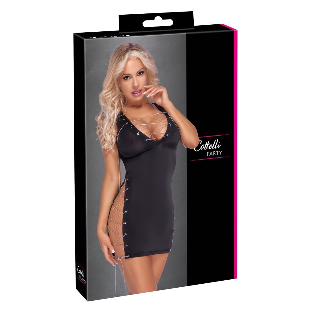 Kleines Schwarzes aufregend geschnürt! Kurzes enges Kleid in semi-transparentem Schwarz mit leichtem edlen Glanz. Rundum weich und elastisch für hohen Tragekomfort. Im tiefen V-Ausschnitt vorne und jeweils seitlich im Rockteil silber-schillernde Ösen mit silberfarbener Kordel für aufregende Schnürungen, die individuell anpassbar sind. Größe S / Materialzusammensetzung: 95% Polyester, 5% Elasthan
