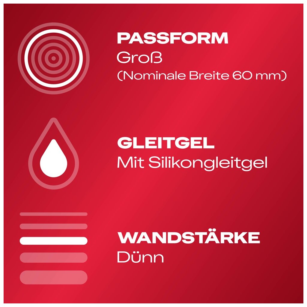 The thin and transparent Durex Gefühlsecht XXL condoms made of natural rubber latex are among the largest condoms on the market. Dimensions: 220 mm long (the usual size is 180 mm). Nominal width 60 mm (usually 52 mm). With silicone-based lubricant. Compared to conventional cylindrical condoms, the innovative anatomical Easy-on shape of Durex condoms offers a little more space in all the right places, ensuring easier donning and a comfortable fit, as well as intense sensation.
