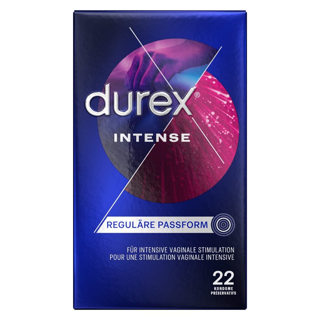 Latexkondome Durex Intense Orgasmic mit Rippen, Noppen und stimulierendem Desirex-Gel für wärmende, kühlende und prickelnde Effekte. Mit Minz-Aroma. Ideale Passform für einen komfortablen Sitz und intensives Empfinden. Transparent und befeuchtet auf Silikonbasis. Mit Reservoir.
