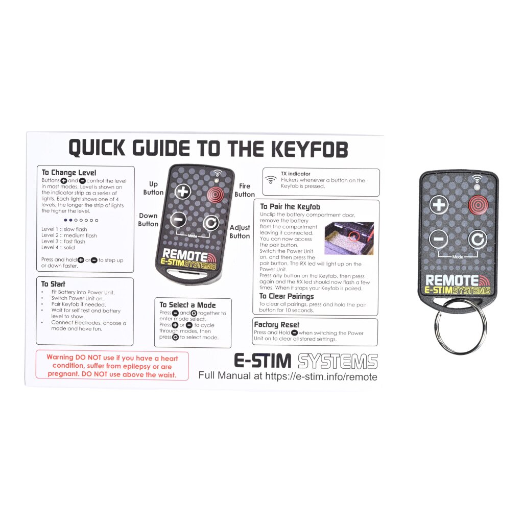 Das neue E-Stim Remote System besteht aus zwei Einheiten, einem kleinen Handsender im Stil eines Schlüsselanhängers und dem Funkempfänger, die Power Unit. Die Power Unit wird an eine Elektrode angeschlossen, die an der Person angebracht oder in sie eingeführt wird, während der Schlüsselanhänger-Sender die Steuerung aus einer Entfernung von bis zu 50 m ermöglicht. Das Paket enthält außerdem einen Satz Klebepads, ein 2-mm-TENS-Verbindungskabel und eine Batterie für die Power Unit (die Batterie für den Schlüsselanhänger (CR2032) ist bereits eingebaut). Außerdem wird eine Kurzanleitung mitgeliefert, die Ihnen einen schnellen Einblick in die Bedienelemente gibt, wenn Sie keinen Zugang zu dieser Online-Anleitung haben.