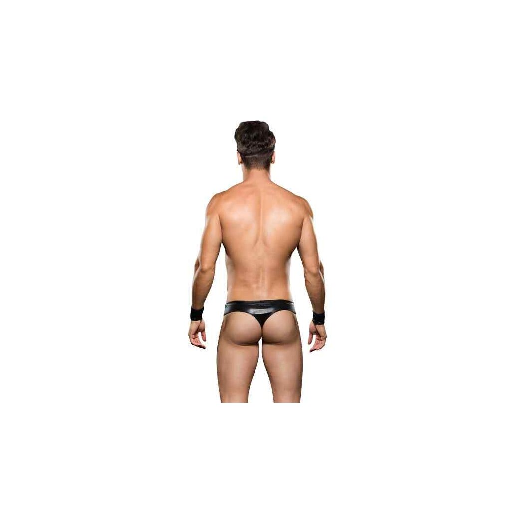 Stare death in the face and get your gears going! Hop on your hog in this three-piece biker costume! The black bikini cut bottoms include a faux gold zipper, as does the matching hat. The black cuffs add that last little detail to complete the look and get you ready for the open road.