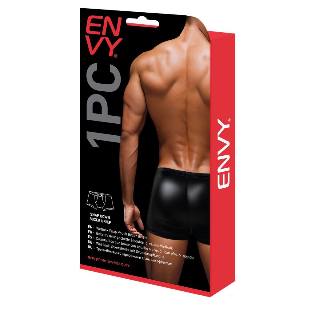 Made from a smooth wet-look material, these boxer shorts offer a visually striking appearance. The highlight is the innovative pouch design with two discreet press studs for a playful appeal. These snaps allow the wearer to show or conceal what's underneath, offering a versatile and customizable aspect to the garment. With a blend of modern aesthetics and bold functionality, these boxers are just the thing for people who want to make a statement in both fashion and intimate moments.