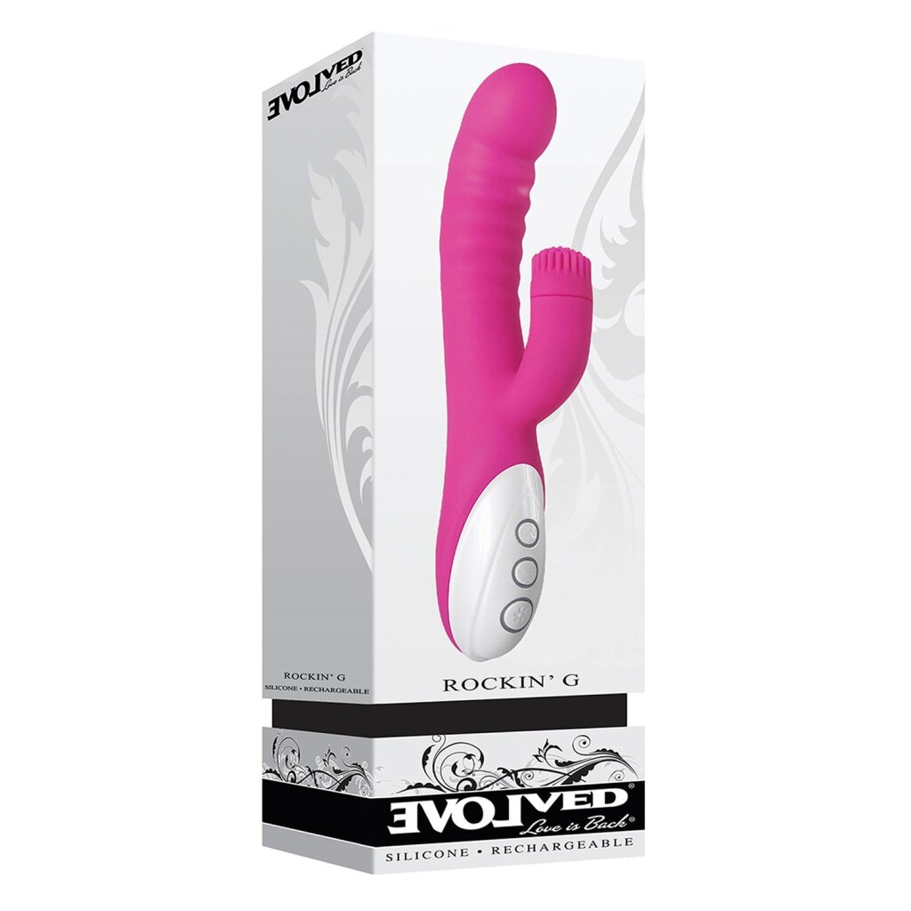 The Rockin' G vibrates towards your G-spot, gently flexing back and forth so you can effortlessly focus on experiencing the most incredible orgasm yet! With the spinning clitoral stimulator and tiny silicone fingers working their magic, you'll experience a duo-gasm that will rock and roll you to complete satisfaction! Made of silicone / 8 vibration functions in the head of the shaft / 5 spinning functions in the clitoral stimulator / Length: 22.3 cm / Depth: 7.1 cm / Width: 4.2 cm / Rechargeable, USB cable included / Waterproof