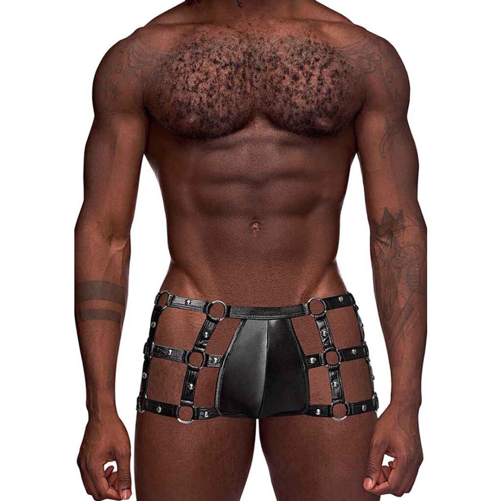 Ce modèle de la collection fétiche de Male Power comprend : Un short-cage échancré avec des bandes de tissu cloutées avec des anneaux métalliques. Taille S/M / Composition : 85% polyester 15% élasthanne