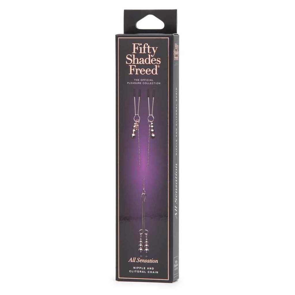 Scharfer Anblick, lustvolles Tragegefühl! Und ein aufregendes Geschenk! Mit Kugeln verzierte Nippel-Klemmen und eine Schamlippen-Klammer sind über Ketten miteinander verbunden. Farbe: Rosé-Gold. Gesamtlänge 70 cm. 50 g schwer. Material: Metall, Silikon.