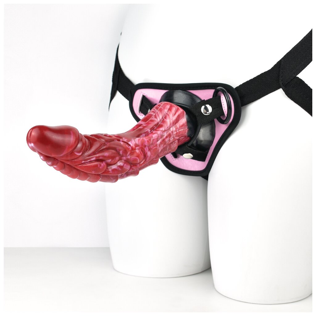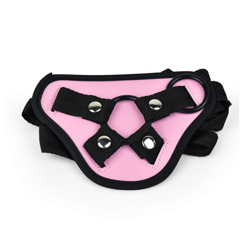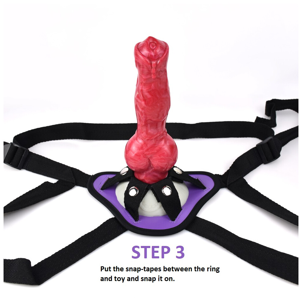The harness is adjustable in size so it can be worn by all. The strap-on harness is placed around the waist and strapped in place. Almost any dildo with a wide base can now be attached to the harness.