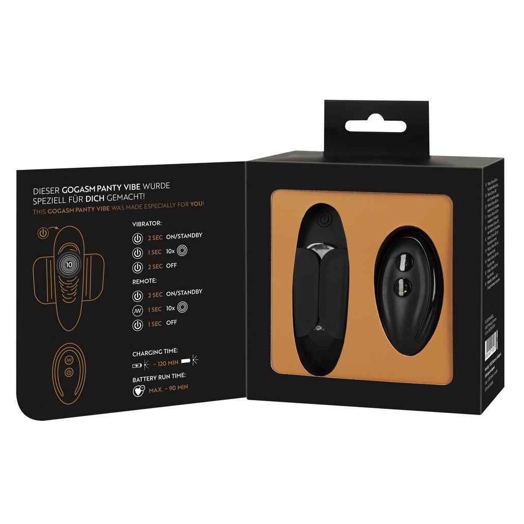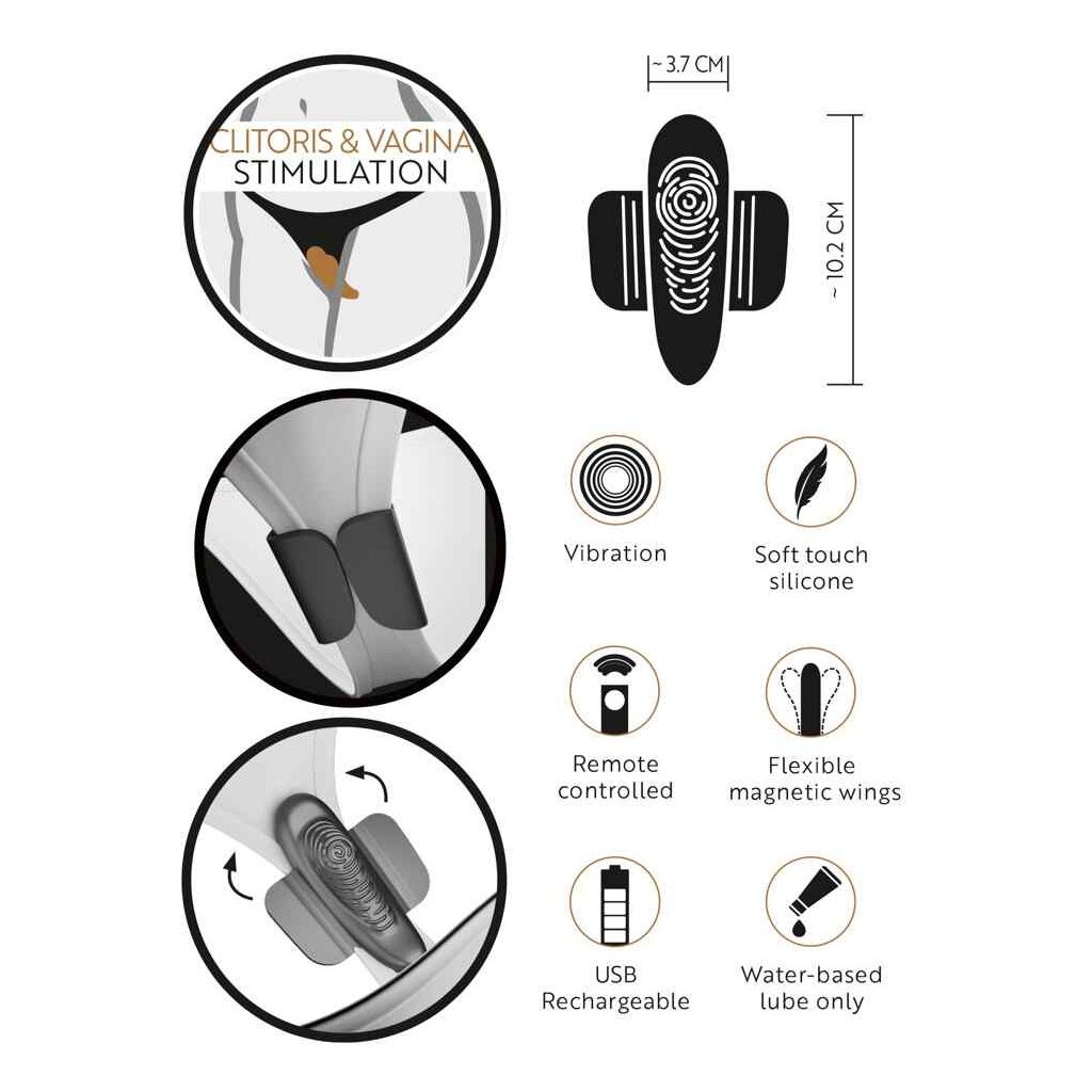 The wonderfully shaped Panty Vibrator from GoGasm has a stimulating texture and magnetic wings for a non-slip fit. It directly stimulates the clitoris and vulva in an intense way. The 10 vibration modes can be easily adjusted with the button on the remote control - it can also be used by a partner for surprising fun and games of control. The quiet but powerful vibrations pleasure anywhere and everywhere. The vibrator is extremely discreet which means that nobody will know its being worn/used! The small, light toy can also be used in the bath or the shower because it is waterproof. The high-quality silicone feels great against the skin when it is being worn and during pleasure. It can be recharged with the included USB cable. There is a battery (CR2032) for the remote control.