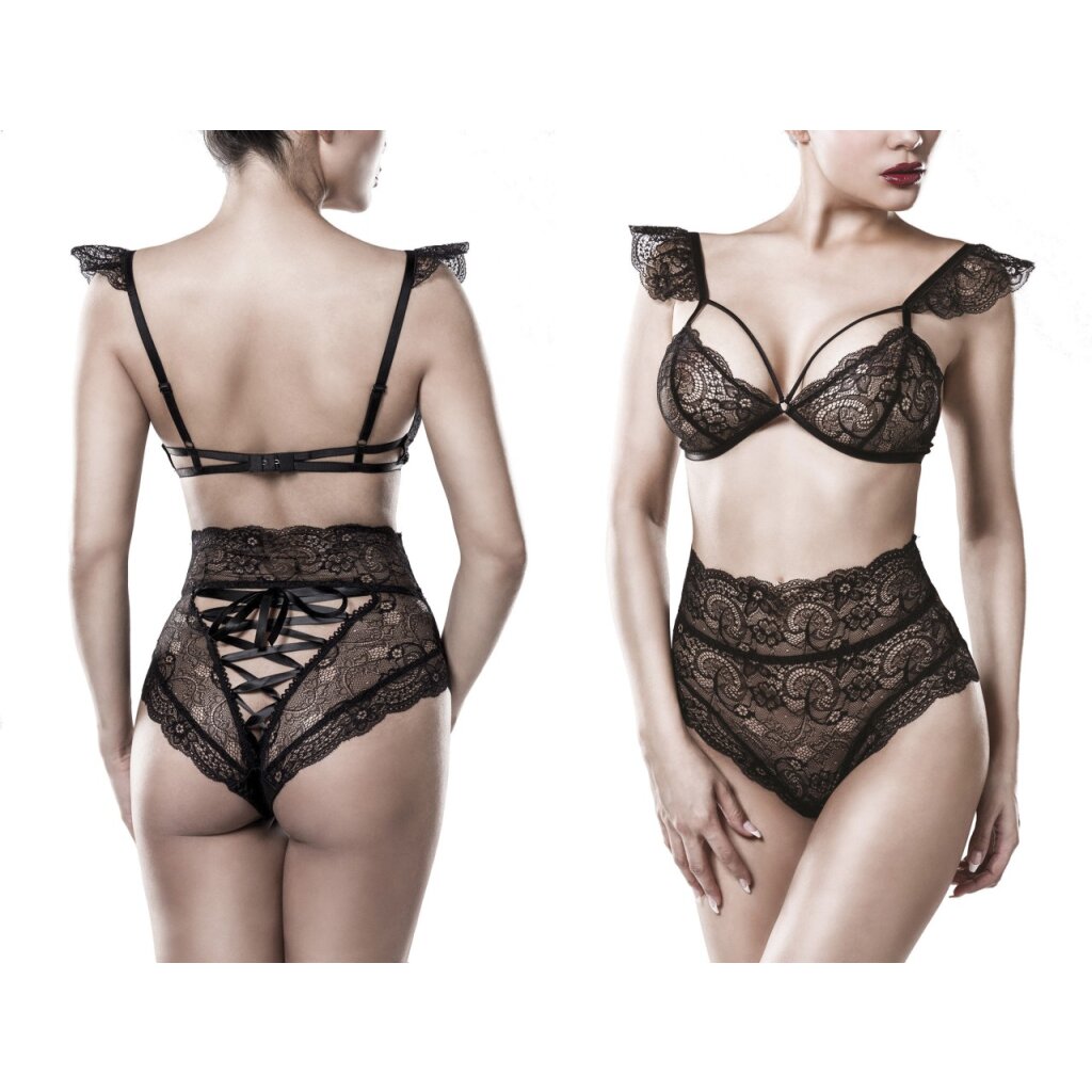 Ensemble érotique 2 pièces de Grey Velvet en dentelle transparente avec motif floral. Soutien-gorge avec petites manches papillon rapportées, slip taille haute assorti inclus. Taille S / Composition : 97% polyamide, 3% élasthanne, dentelle : 100% Polyester