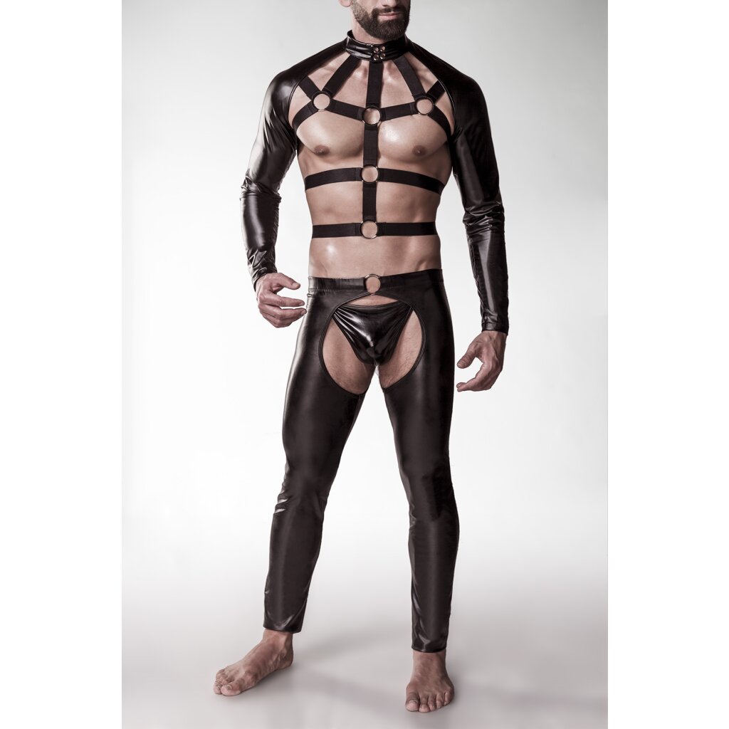 Bolero made of high-quality imitation leather, harness top made of soft elasticated straps. Top is attached to chaps, tight-fitting chaps with elasticated waistband including matching thong. Size S/M / Material composition: 100% Polyurethane