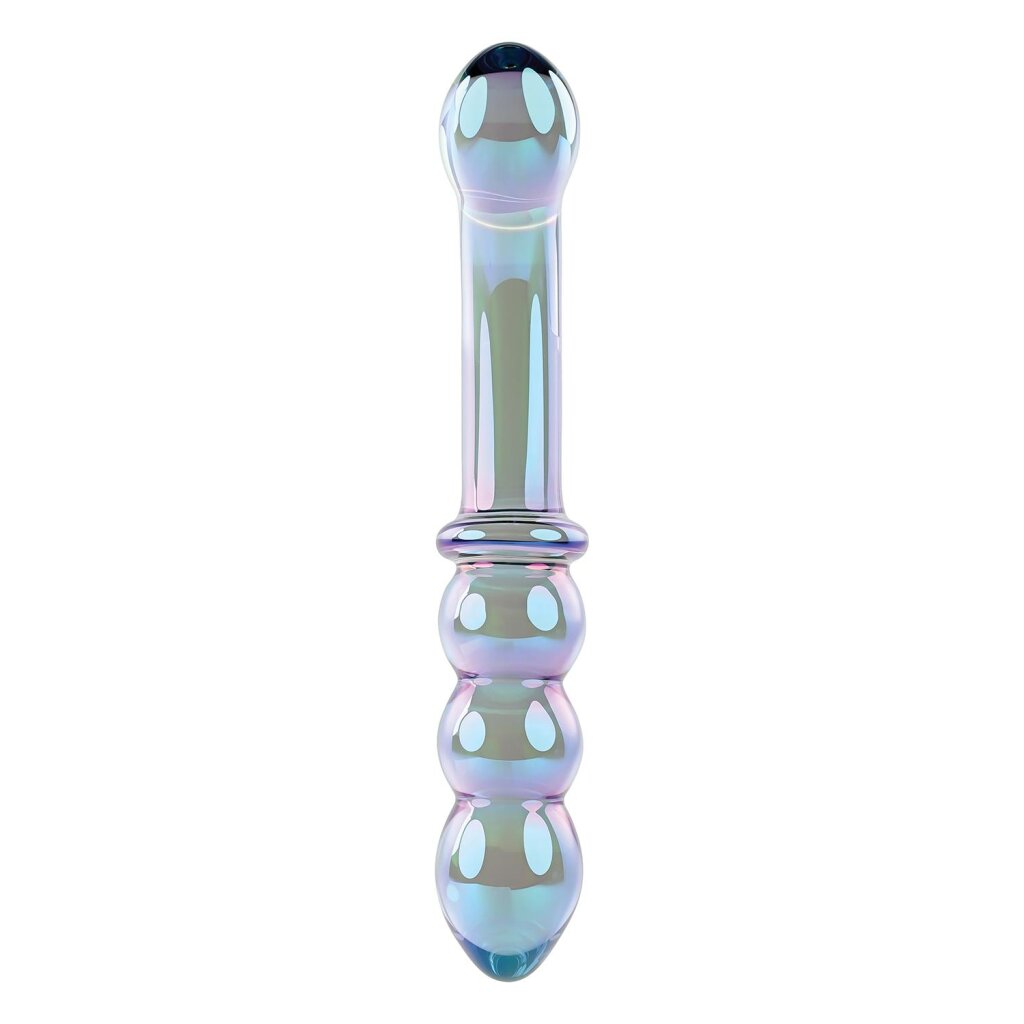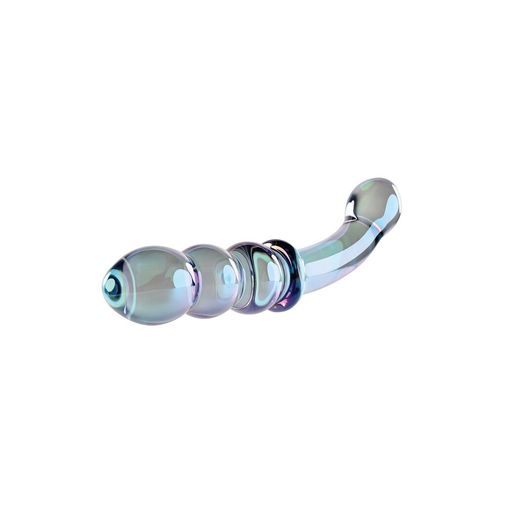 Découvrez le pur plaisir d'un masseur en verre lisse. La surface de cette beauté irisée bleu-vert-violet est non poreuse et extrêmement hygiénique. Elle est délicieusement lisse et souple, surtout avec votre lubrifiant préféré. Essayez l'extrémité légèrement incurvée avec sa tête généreuse et bulbeuse, ou profitez de l'extrémité à trois perles avec sa pointe effilée et ciblée. Un anneau entre les deux tiges assure une prise sûre pour que vous puissiez vous concentrer sur le plaisir ultime que seul le verre peut procurer ! Trempez-le dans l'eau chaude ou froide avant de jouer pour ressentir la température érotique.