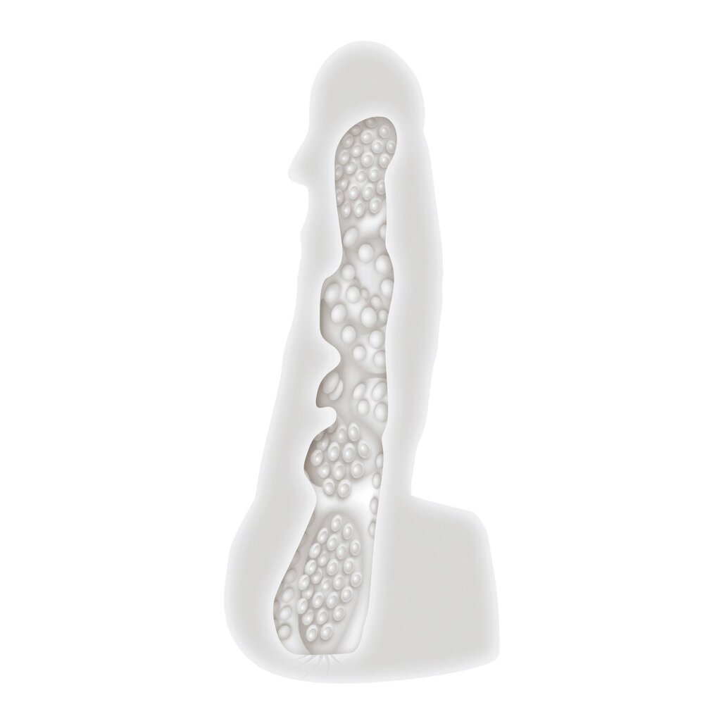 This super stretchy, see-through toy was designed with multiple pleasure options in mind. Its outer profile is long and elegant, with an erotic, lifelike design that ends with a generous cushion that feels so satisfying. Inside the soft base is a circular opening that flows into a textured channel for a sexy, squeezed-in feel that can be seen through the sheer material as you play! Navigating the stroker is a pleasure thanks to the easy-grip shape, and the included vibrating ring adds an extra 10-stage experience no matter where you use it.
