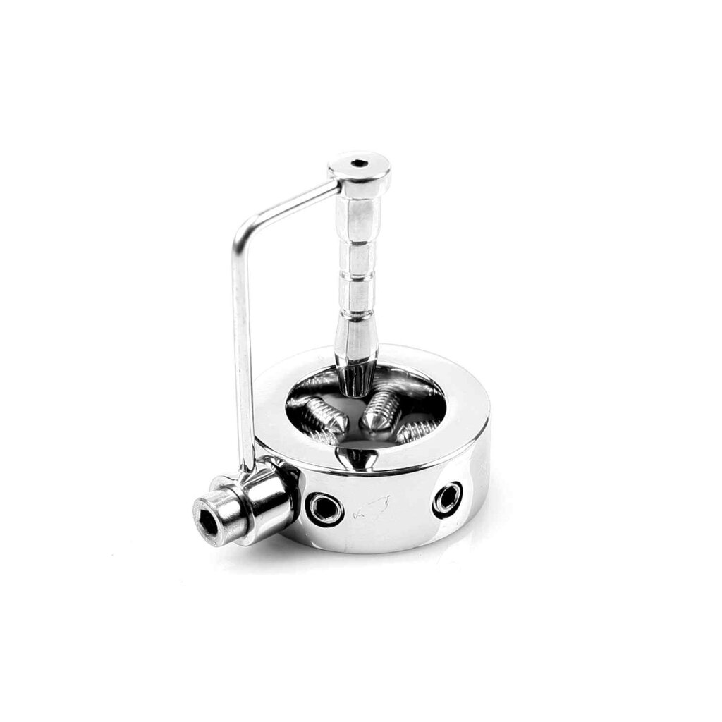 This small thick penis ring with plug is not suitable for the delicate souls among us. On the inside of the ring there are 6 spikes, simply turn the spikes outward by turning them anti-clockwise with the included hex key, place it over your penis's head, insert the penis plug into the peehole and start turning the spikes clockwise to get a pain level that is suitable to your liking!