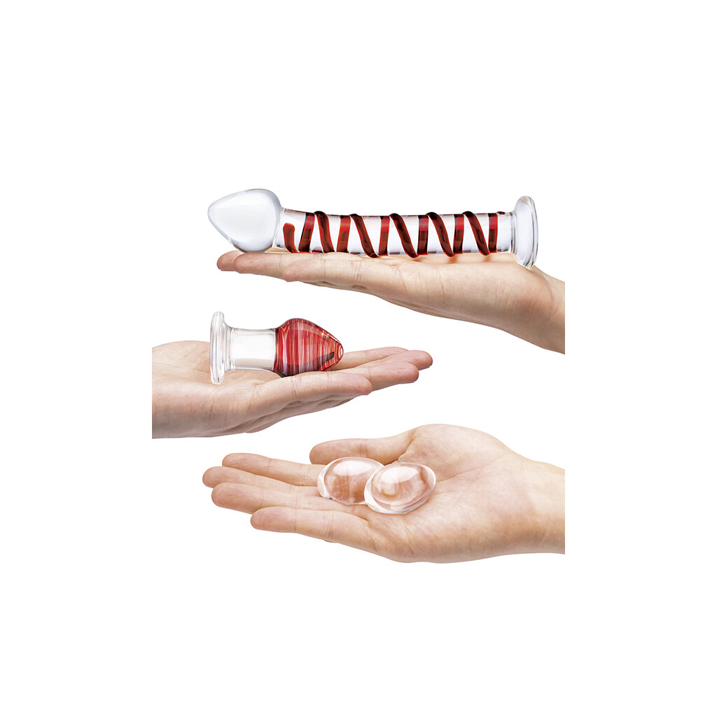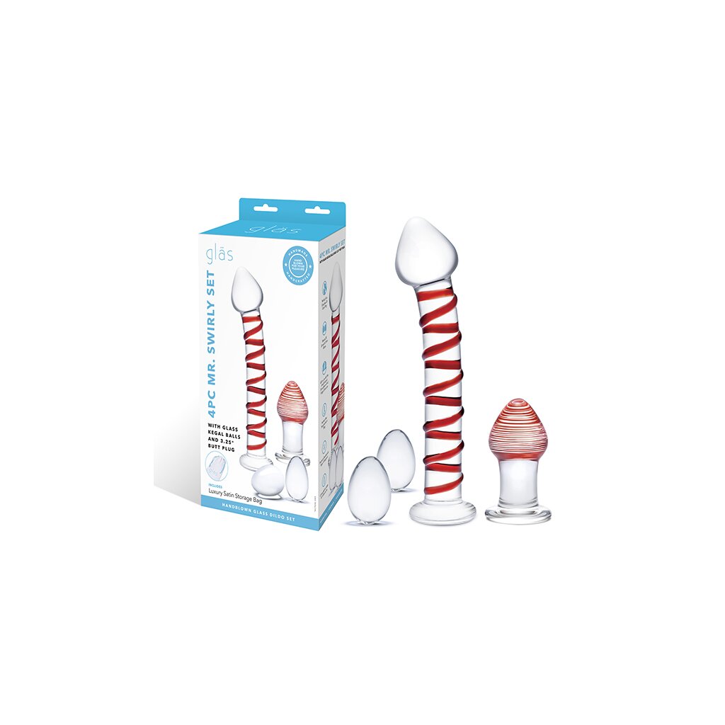 Idéal pour les jeux en couple ou en solo, le set Gläs 4 pièces Mr. Swirly offre une variété d'options pour un plaisir intense - de deux boules Kegal à un gode Mr. Swirly en passant par un butt plug de 3,25", tous fabriqués en verre de première qualité. Le plug anal de pointe de l'ensemble est parfait pour les débutants ou les novices, leur permettant d'explorer la stimulation anale à leur propre rythme. Et le gode Mr. Swirly peut facilement être utilisé pour la stimulation du point G. Les Kegal balls, quant à elles, ont été conçues pour renforcer le vagin. Les boules Kegal, également connues sous le nom de boules Ben Wa, sont des boules compactes qui peuvent être insérées confortablement dans le vagin et utilisées pour renforcer les muscles vaginaux et pelviens de la femme. Plus les muscles vaginaux et pelviens sont renforcés, plus les orgasmes peuvent être intenses. Et les boules de Kegal peuvent être chauffées ou refroidies, selon les préférences de l'utilisateur, pour procurer des sensations délicieuses.