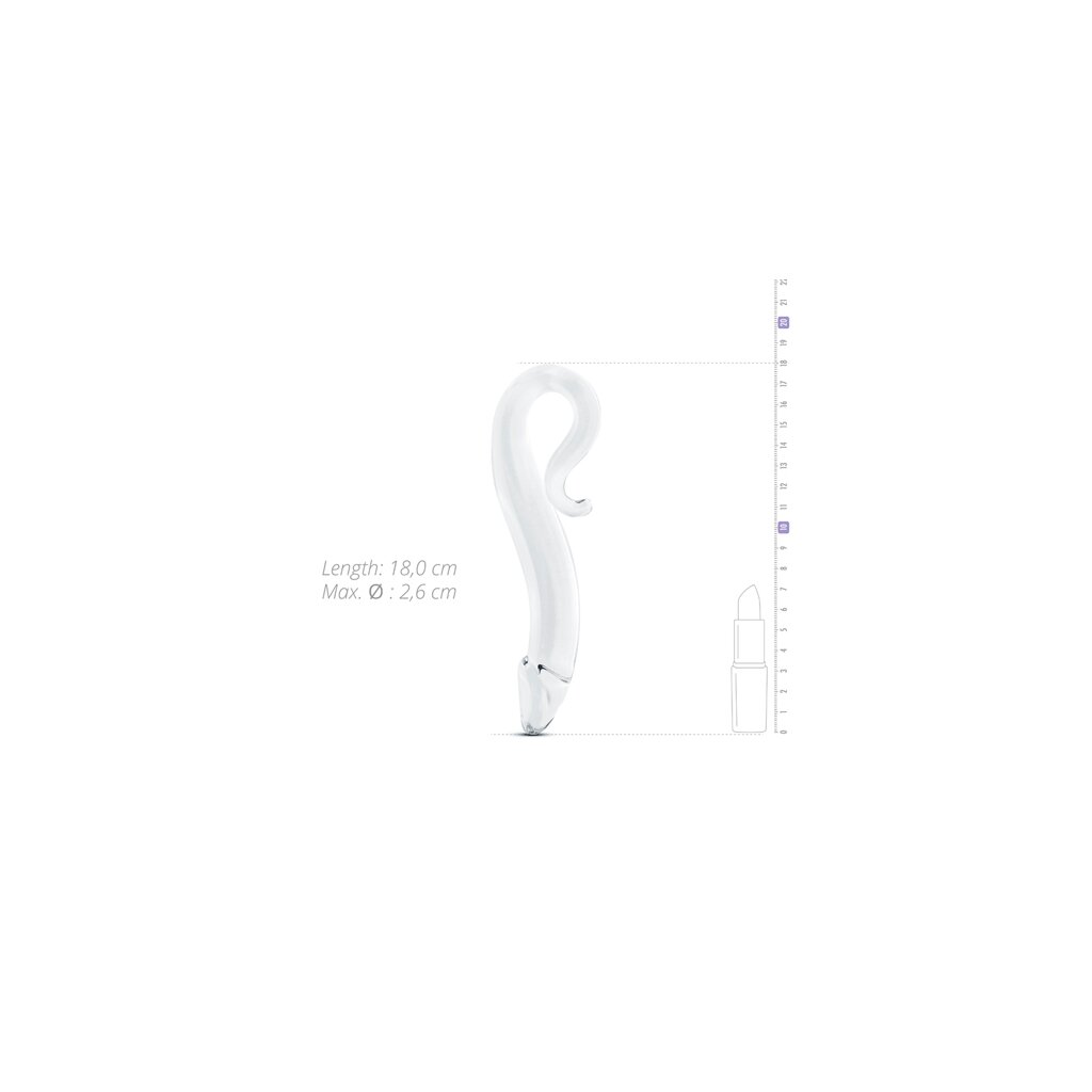 Discover your most sensitive spots with this unique dildo. The dildo is completely made of glass. It is transparent, strong, durable and extra smooth. The bent tip makes it possible to reach your sensitive spots, like the prostate or G-spot. The toy is safe for use in combination with any type of lubricant and it has an elegantly shaped handle for a perfect grip in any situation. Clean the dildo before and after use with water and toy cleaner.