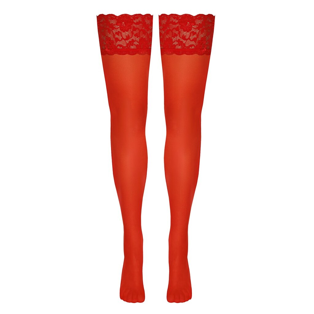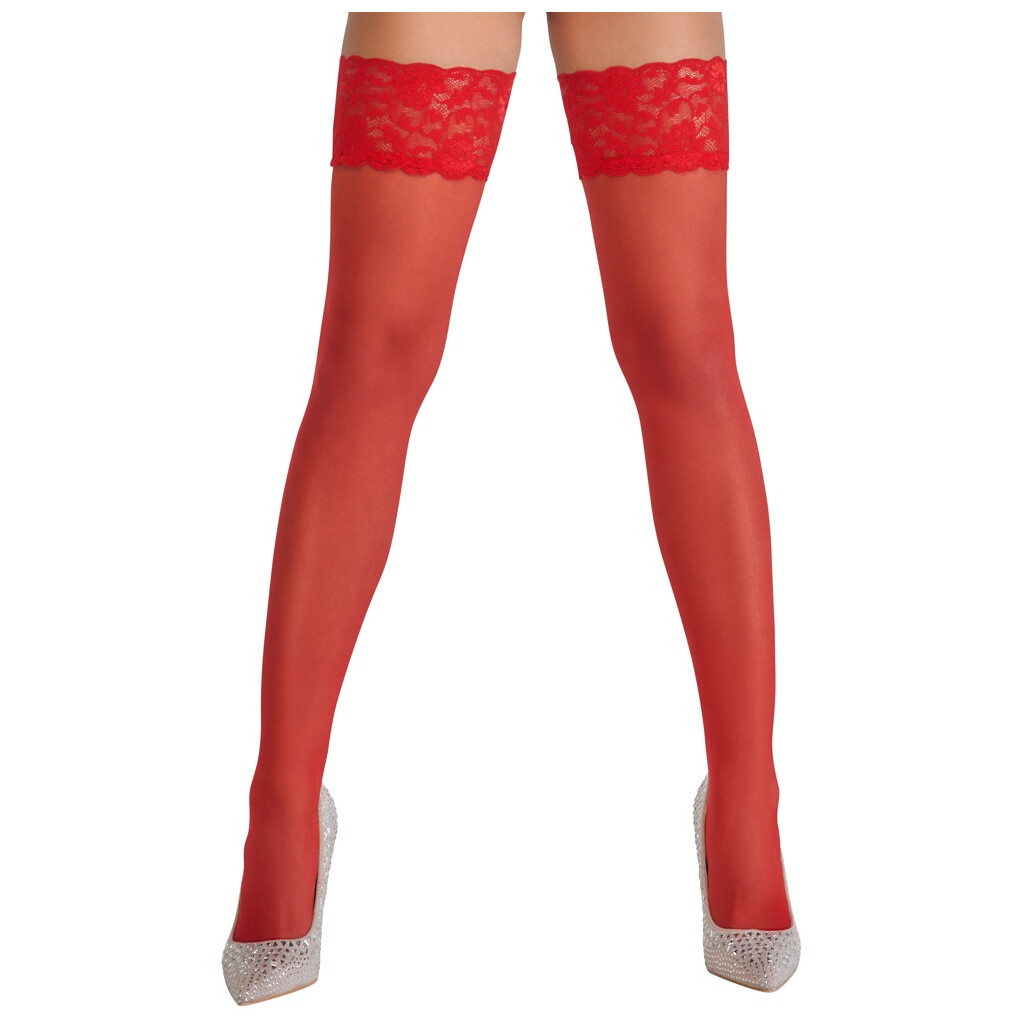 Halterlose, rote Strümpfe von Cottelli LEGWARE mit schönem 9 cm breitem Spitzen-Abschluss. Innen mit Silikonverstärkung für rutschfesten Sitz und optimalen Halt. Garnstärke 20 den. Oeko-Tex zertifiziert.