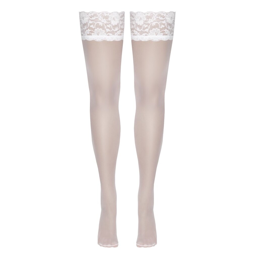 Weiße halterlose Strümpfe von Cottelli LEGWARE mit einem schönen 9 cm breiten Spitzenabschluss. Mit Silikonverstärkung auf der Innenseite für einen rutschfesten Sitz und optimalen Halt. Garnstärke 20 Denier. Öko-Tex zertifiziert.