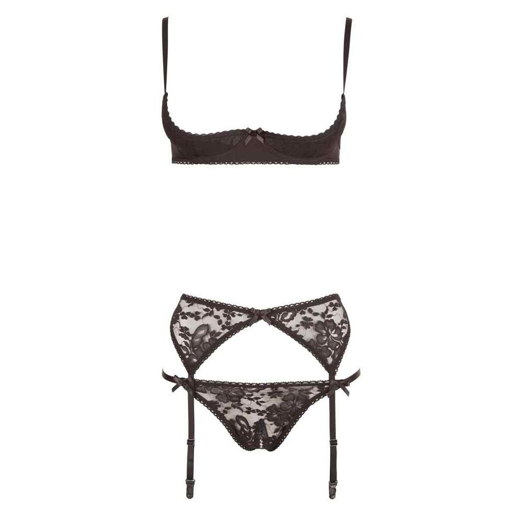 Trio Femme Fatale! Shelf bra, crotchless G-string and suspender belt in a set. All three items are made of black lace. Shelf bra with slightly padded cups, G-string with open crotch. 90 polyamide, 10% spandex. Without stockings.