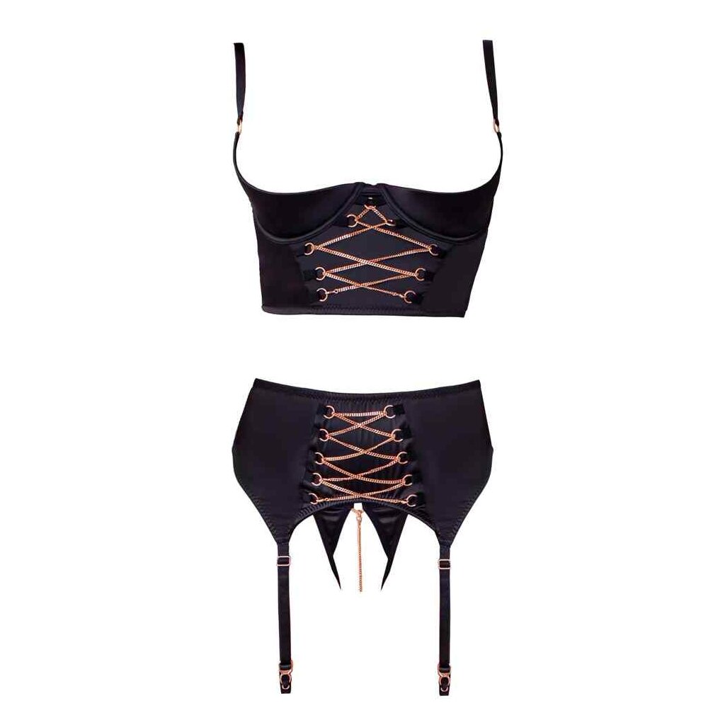 Soutien-gorge à étagères légèrement rembourré, porte-jarretelles et string sans entrejambe de la marque Abierta Fina en beau satin noir extensible avec des détails de couleur rose-or. Le soutien-gorge à armatures est long, avec une fermeture à crochets dans le dos et des bretelles réglables. Le large porte-jarretelles a également une fermeture à crochets à l'arrière et des bretelles réglables. Le soutien-gorge et le porte-jarretelles sont tous deux pourvus de petites chaînes qui forment un laçage sur le devant. Le string assorti est complètement sans entrejambe et possède une chaîne amovible au-dessus de l'entrejambe.