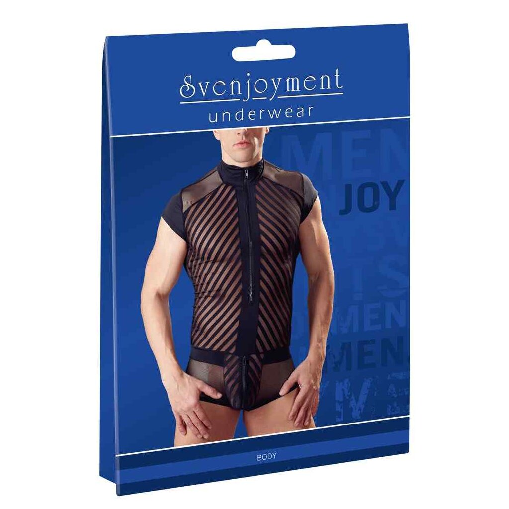 Warum nicht zeigen, was Mann hat? Dieser Kurzbody mit kurzem Arm setzt Sie raffiniert in Szene! Der Materialmix aus zwei Netzarten und die angesagte Streifenoptik gewährt dem Betrachter aufregende Einblicke. Reißverschluss vorne und im Beutel unterlegt. Schwarz. 90% Polyamid, 10% Elasthan.