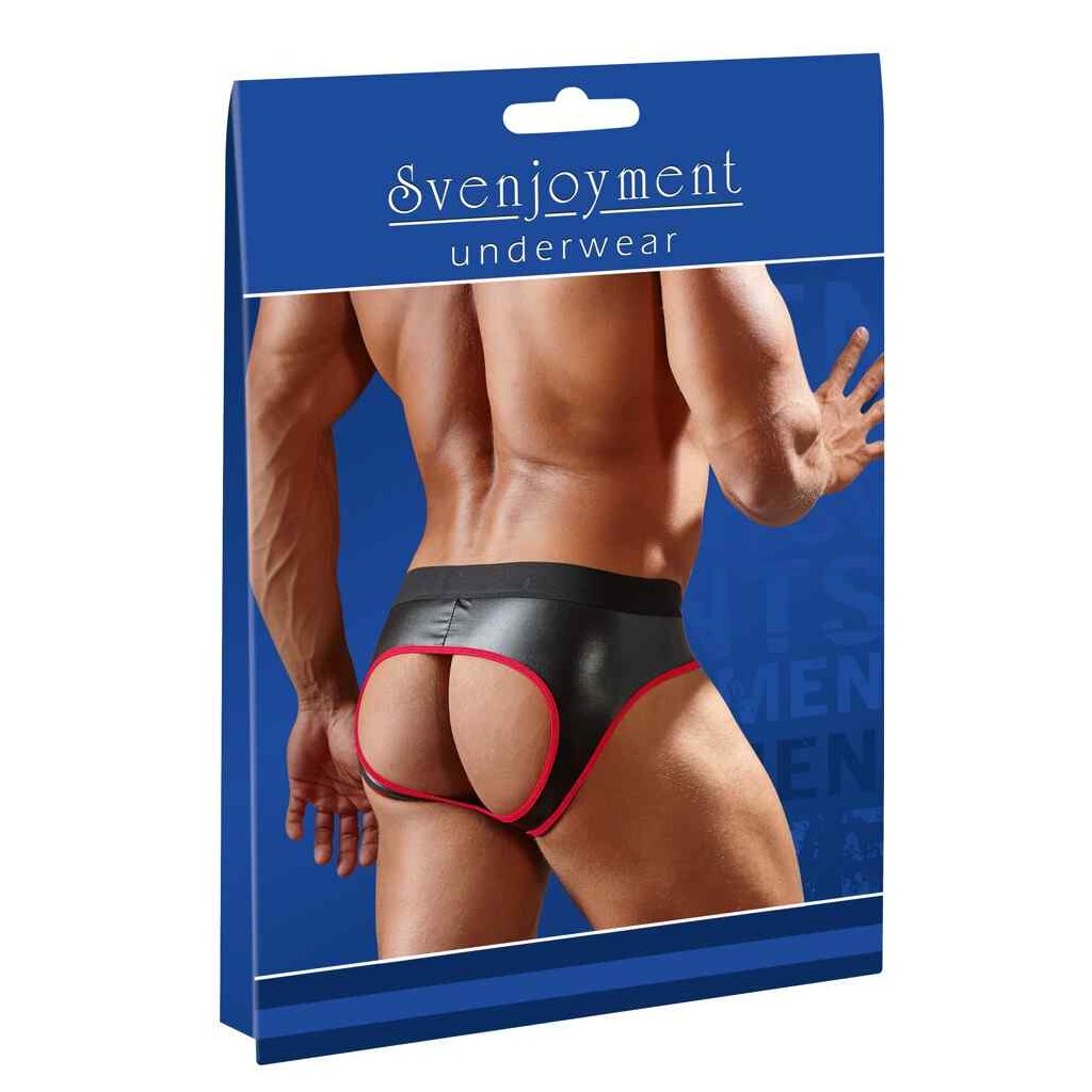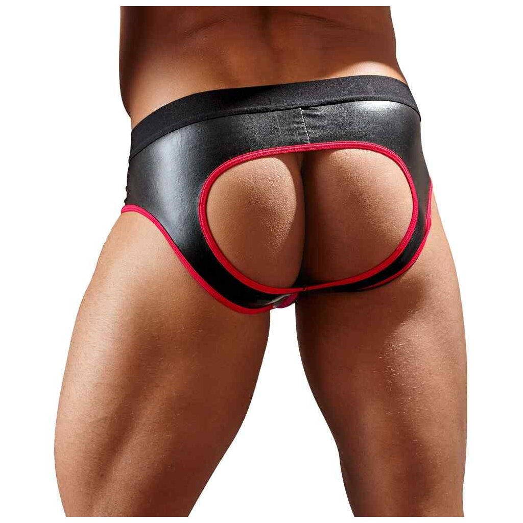 What a sexy sight! Slip into this shiny matte jock in a neoprene/rubber design and enjoy seducing your partner. Open at the back. Black, red. 60% polyurethane, 36% polyester, 4% spandex.