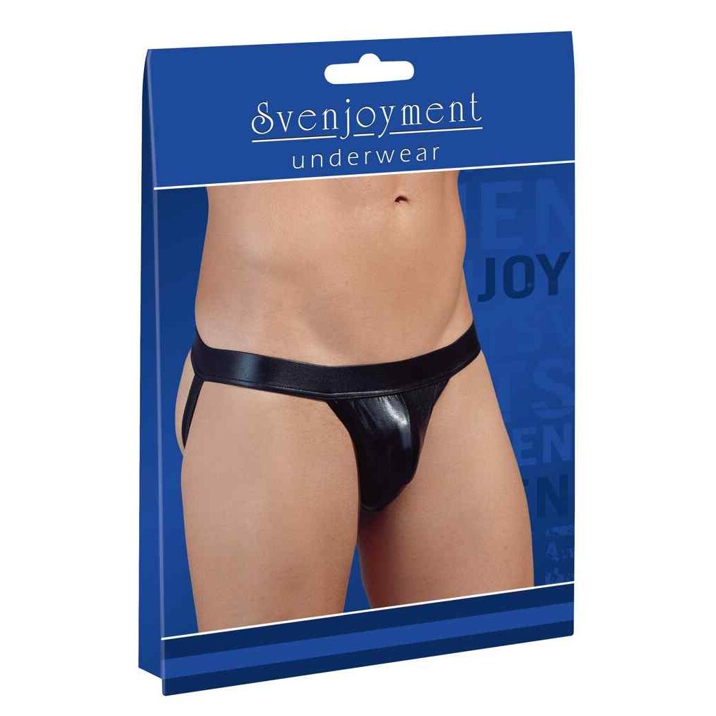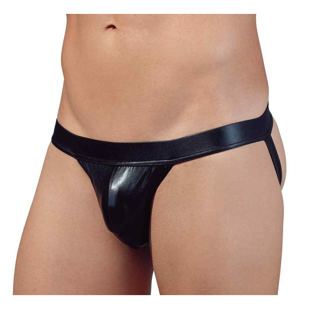 Stretchy, jock noir brillant. La ceinture et les jockstraps sont recouverts de matière. 92% polyester, 8% spandex.