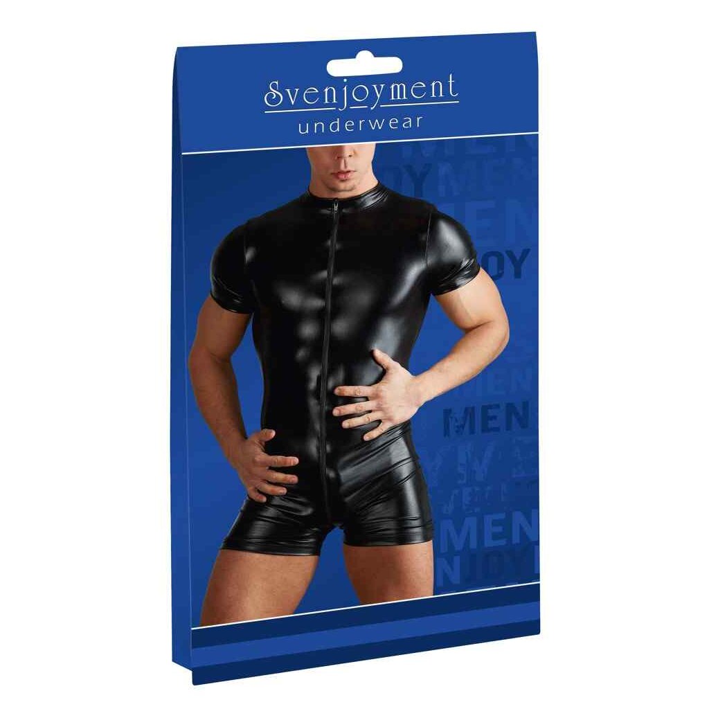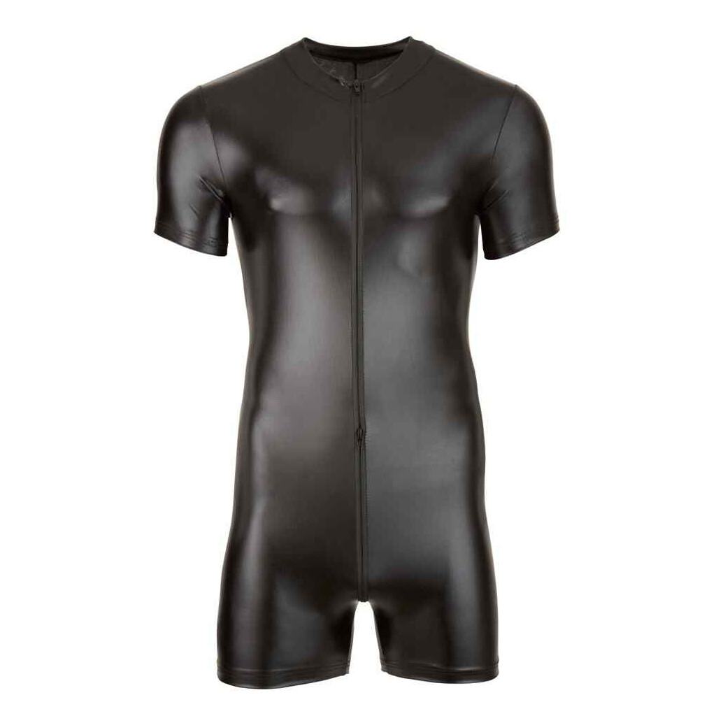 Einladend maskulin! Körperbetonender Kurz-Overall im Mattlook. Mit kleinem Stehkragen und 3-teiligem Reißverschluss - halsabwärts durch den Schritt bis über den Po. Schwarz. 92% Polyester, 8% Elasthan.