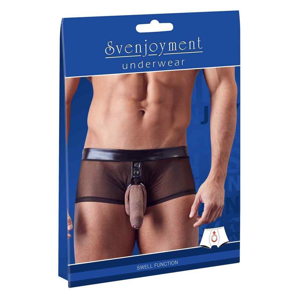 Pure masculinity! Fancy pants made out of powernet with wet look details. The attached cock ring (Ø 5 cm) and the jockstraps add the finishing touches to this hot look. Wonderfully stretchy and with a swell function.