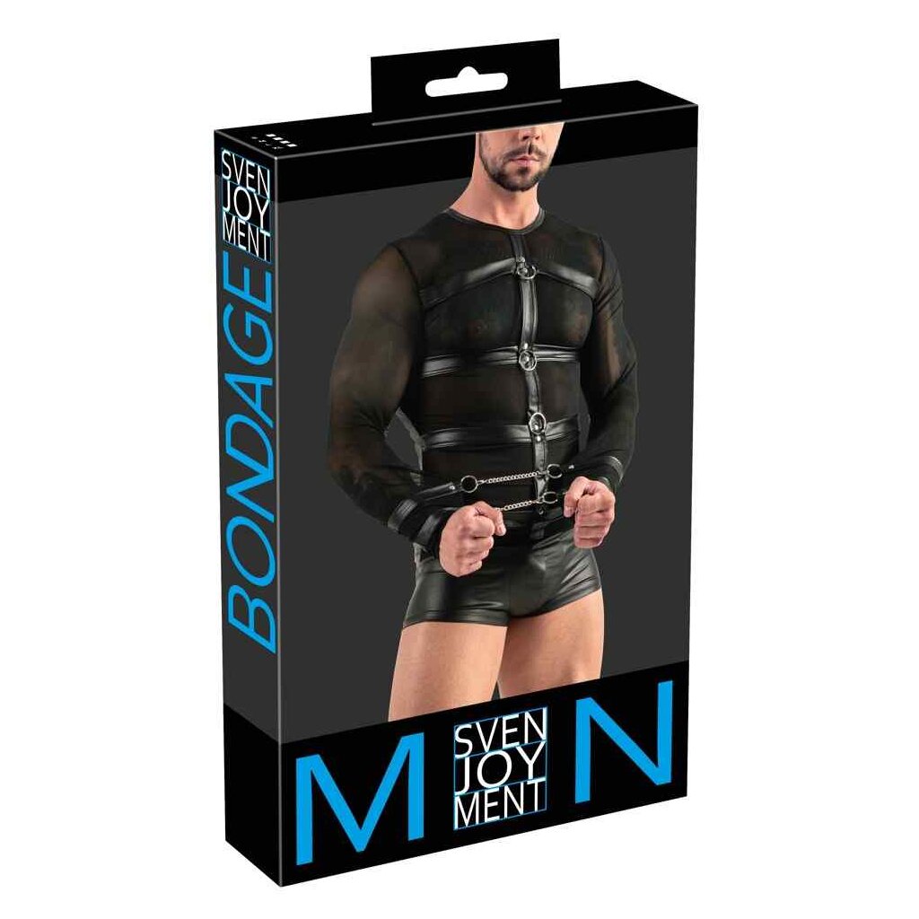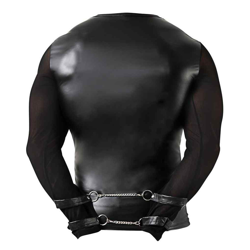 Langarm-Shirt von Svenjoyment Bondage aus elastischem weichem Powernet mit aufgestepptem und mit Ringen besetztem Harness vorne. Rücken komplett im trendigen Mattlook. Lange Powernet-Ärmel am Ende mit aufgesteppten Mattlook-Fesselriemen, die mit Ringen versehen sind, in die beiliegende kurze Verbindungskette mit den Karabinern handfesselnd eingehakt werden kann.