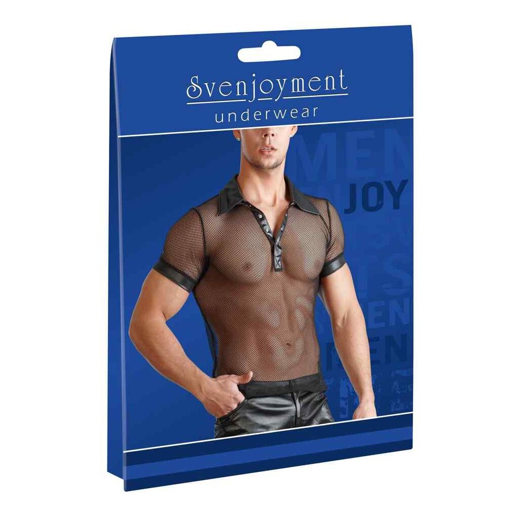 What a sexy sight! Show off in this masculine polo shirt with press studs that stop at the chest and women will be throwing themselves at your feet. The shirt is also made out of a seductive mixture of net and wet look. Black. 100% polyester.