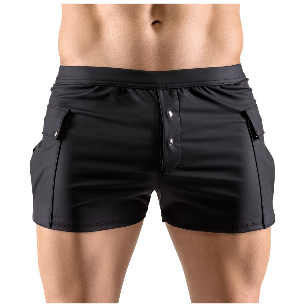 Schwarze, locker sitzende Shorts von Svenjoyment aus leichtem Stretch-Material mit trendigem Matteffekt. Im Worker-Style mit Druckknopfleiste, sowie 2 großen Taschen an der Seite und 2 aufgesetzten Taschen am Gesäß - alle Taschen mit Druckknopfleiste.