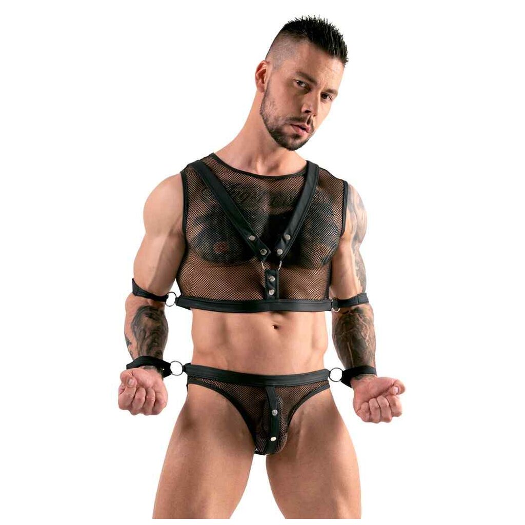 Bauchfreies Top und pofreier Jock von Svenjoyment Bondage aus weichem elastischen Netz mit Mattlook-Details. Top mit fest angenähtem Harness. Jock vorne am Beutel mit praktischen Druckknöpfen zum Öffnen. Beide Teile jeweils seitlich mit einem Ring für die 4 beiliegenden Soft-Fesselriemen mit verstellbaren Klettverschlüssen.