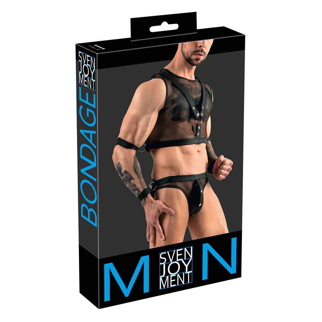 Bauchfreies Top und pofreier Jock von Svenjoyment Bondage aus weichem elastischen Netz mit Mattlook-Details. Top mit fest angenähtem Harness. Jock vorne am Beutel mit praktischen Druckknöpfen zum Öffnen. Beide Teile jeweils seitlich mit einem Ring für die 4 beiliegenden Soft-Fesselriemen mit verstellbaren Klettverschlüssen.